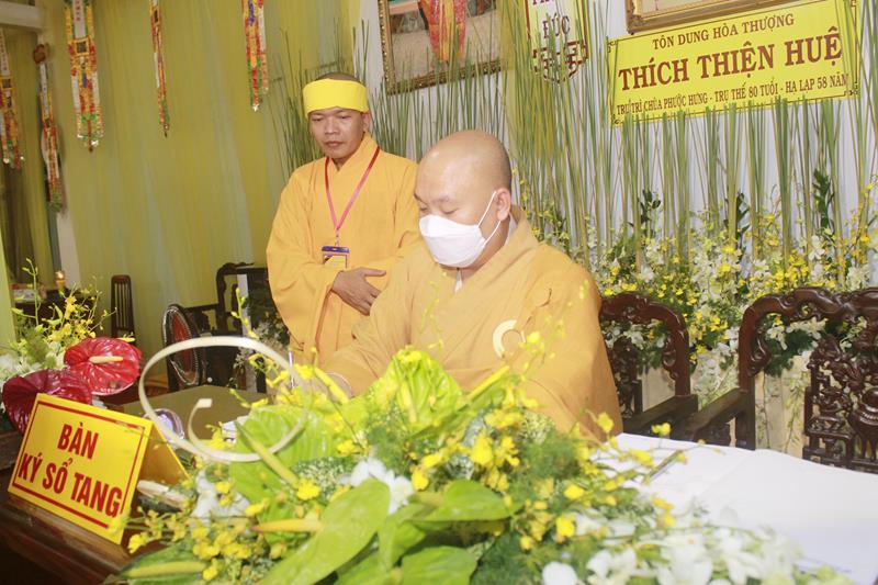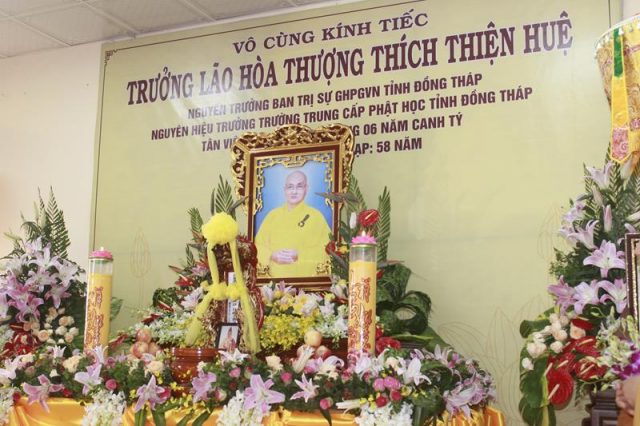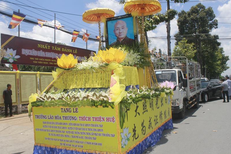 Theo chương trình tang lễ, sáng nay vào lúc 10h 30 phút tại chùa Phước Hưng (Sa Đéc – Đồng Tháp) sẽ diễn ra lễ Truy niệm & Cung tống Kim quan Trưởng lão Hòa thượng Thích Thiện Huệ – Thành Viên Hội Đồng Chứng Minh Giáo hội Phật giáo Việt Nam; Chứng minh Ban Trị sự Giáo hội Phật giáo Việt Nam tỉnh Đồng Tháp,  Nguyên Ủy viên  Hội đồng Trị sự Giáo hội Phật giáo Việt Nam; Ủy viên Ban Tăng Sự Trung Ương Giáo hội Phật giáo Việt Nam; Trưởng Ban Trị sự GHPGVN tỉnh Đồng Tháp nhiệm kỳ VI, VII; Thành viên UBMTTQ Việt Nam tỉnh Đồng Tháp nhiều nhiệm kỳ; Hiệu Trưởng trường Trung cấp Phật học tỉnh Đồng Tháp; Trụ trì chùa Phước Hưng, Phường 1, Thành phố Sa Đéc, tỉnh Đồng Tháp đến nơi trà tỳ.
