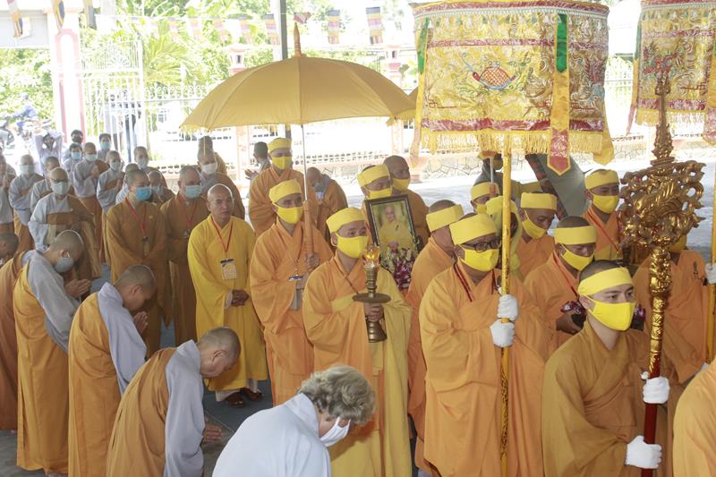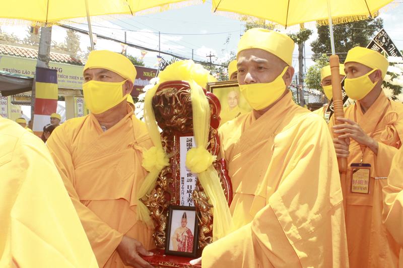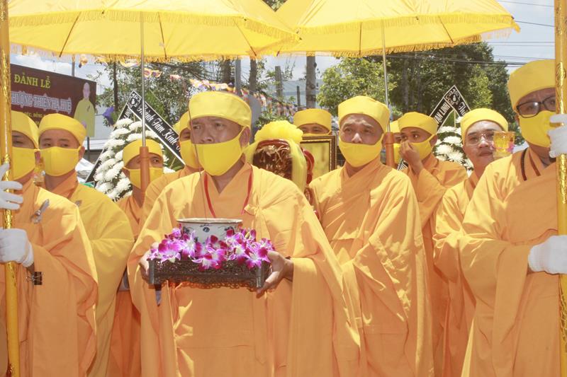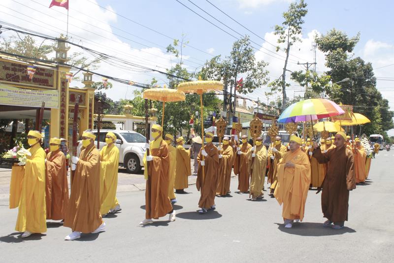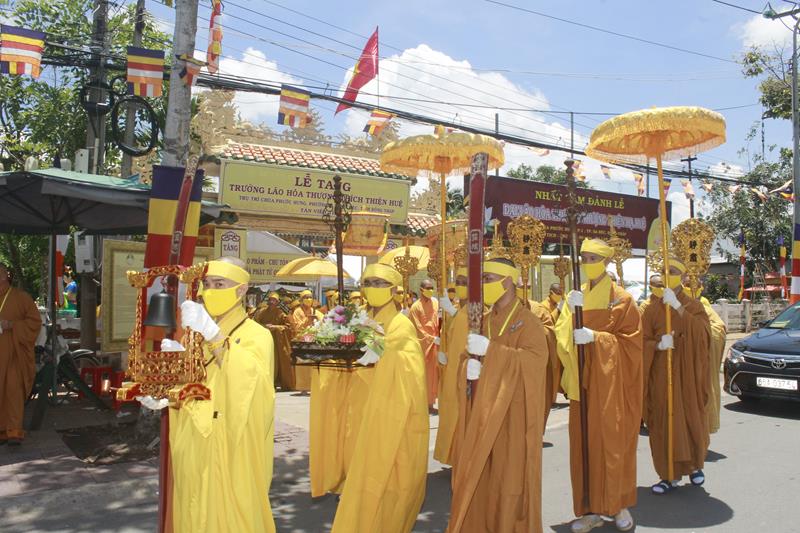 Trong không gian trang nghiêm, thanh tịnh nơi đất Già lam linh địa Phước Hưng, Đại Đức Thích Chơn Tâm, Chánh Thư ký BTS PG tỉnh Đồng Tháp – Hiệu Trưởng trường TCPH Đồng Tháp, môn đồ pháp quyến đã cung thỉnh Giác Linh cố Trưởng lão Hòa thượng tân viên tịch rời khỏi chùa Phước Hưng trong tiếng niệm Phật và chuông trống Bát-nhã trầm hùng.