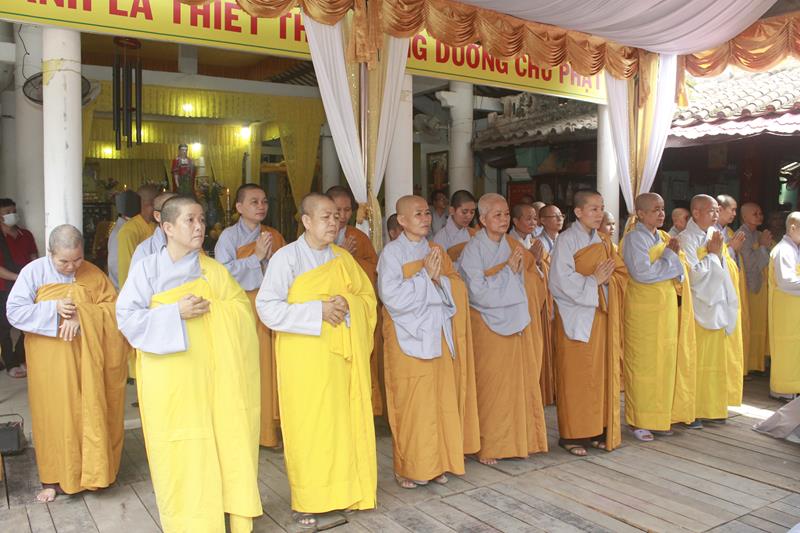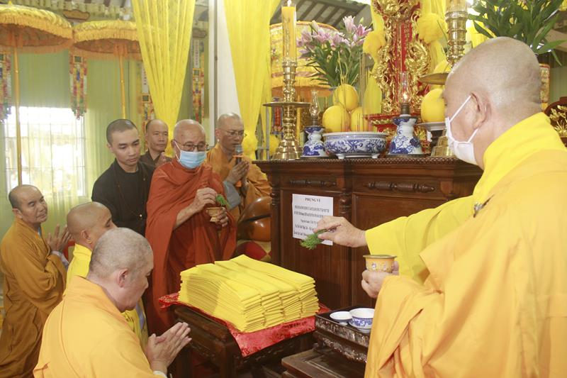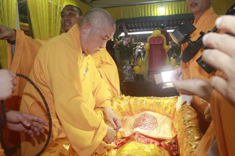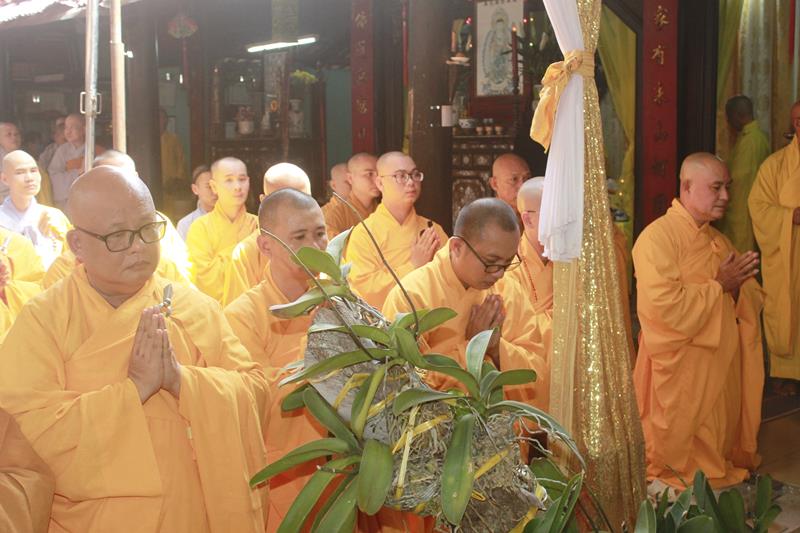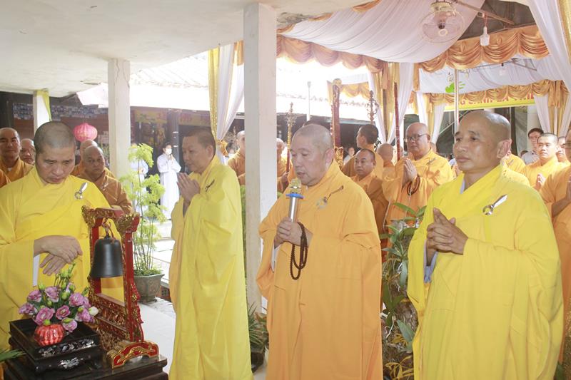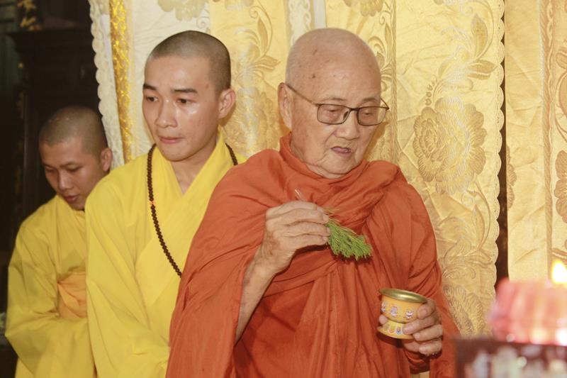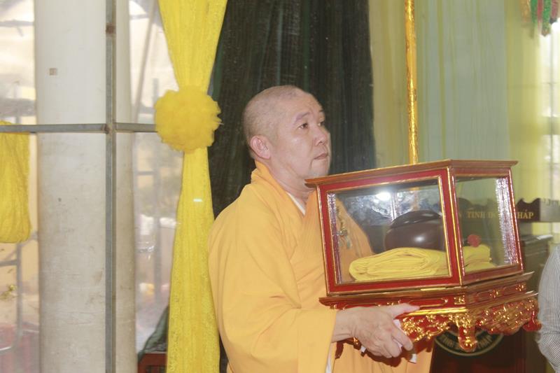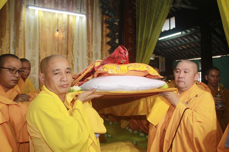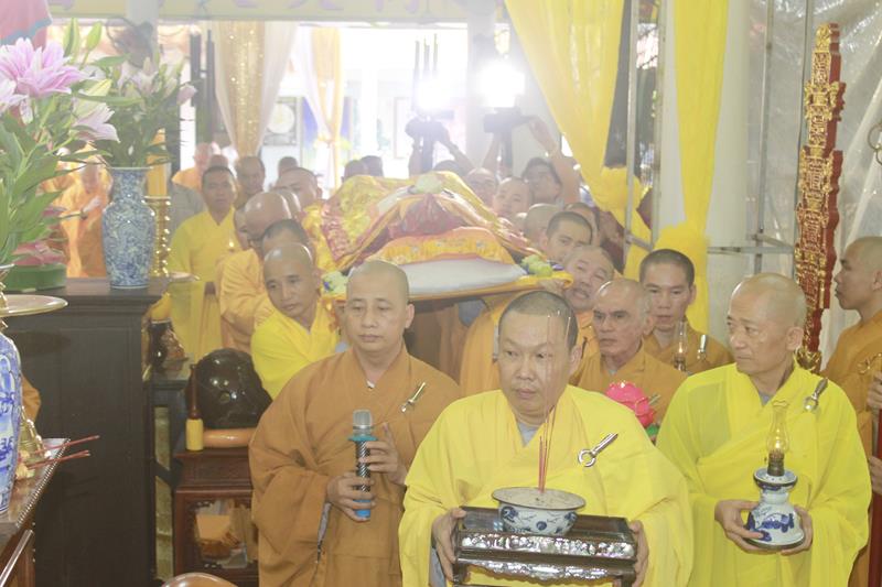 Tại buổi lễ, chư Tôn đức đã niêm hương bạch Phật, thực hiện nghi thức thiền môn, sái tịnh kim quan, cầu nguyện Giác linh Đại lão Hòa thượng cao đăng Phật quốc, hội nhập Ta bà, tùy duyên hóa độ. Trầm hương quyện tỏa, chuông trống Bát-nhã trầm hùng, hòa chung tiếng niệm Phật của chư Tôn giáo phẩm Tăng Ni, đông đảo quý Phật tử và môn đồ pháp quyến đã chắp tay, chánh niệm đồng niệm danh hiệu Phật và cung thỉnh nhục thân Ngài từ thiền thất đến nơi tôn trí kim quan tại lễ đường để nhập kim quan.