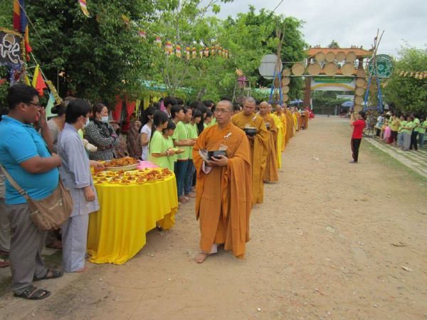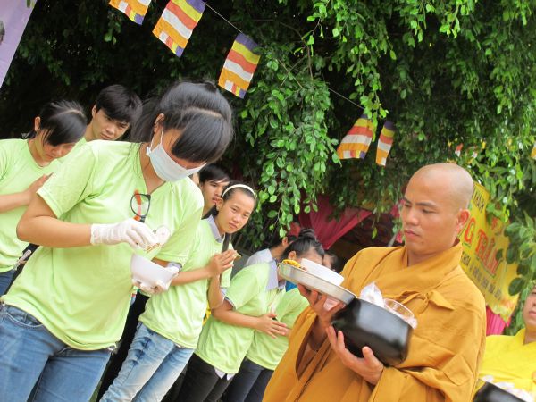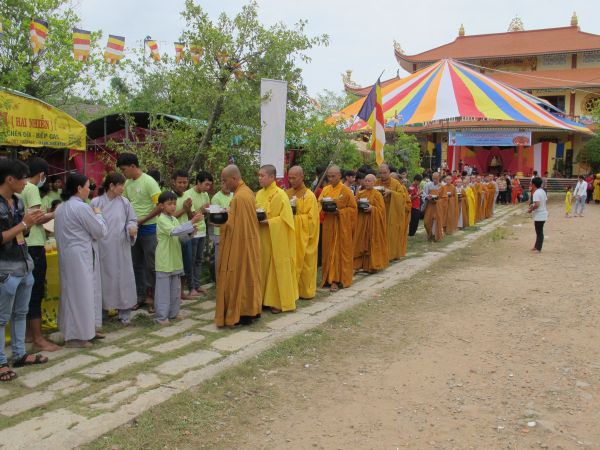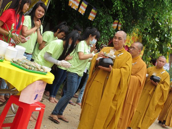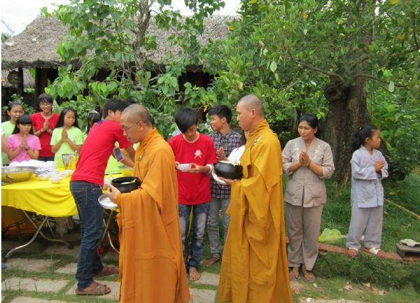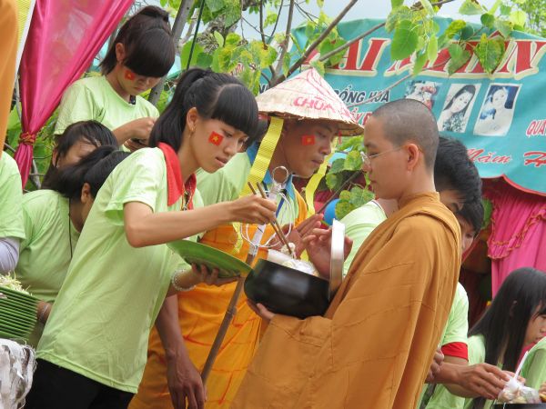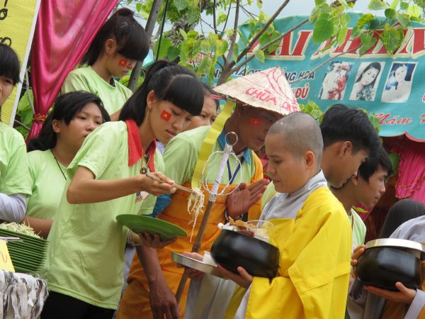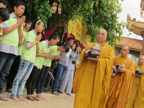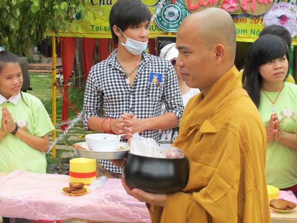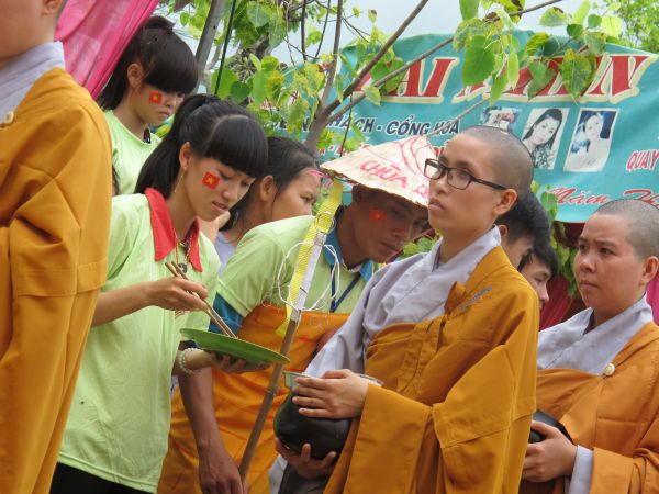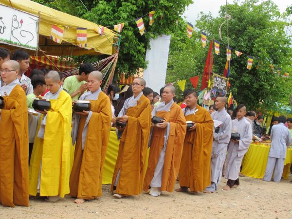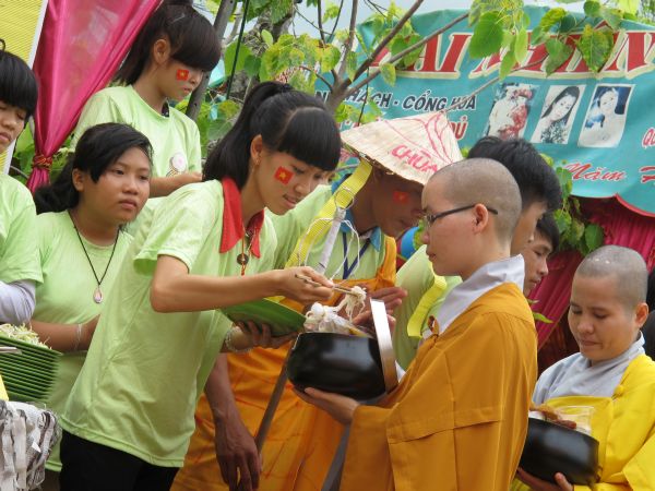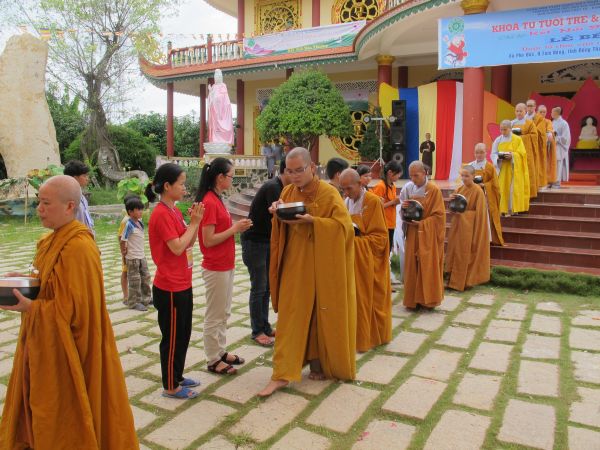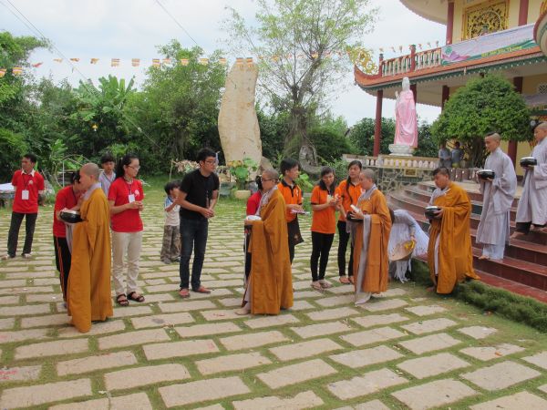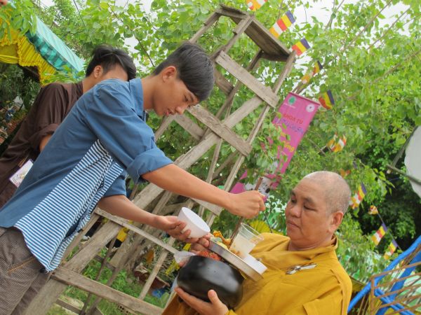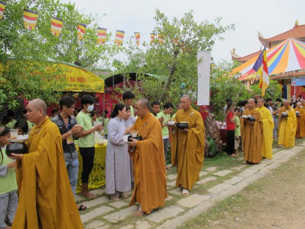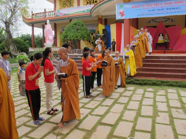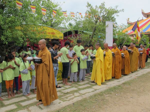 Trong khung cảnh trang nghiêm thanh tịnh, chư tôn đức Tăng Ni với dáng đi oai nghiêm, tĩnh tại giữa cái nắng gắt chói chang của mùa hè. Các bạn trẻ nghiêm trang chắp đôi bàn tay thành kính, cung nghinh đón chư tôn đức đến khất thực. Cầm trên tay với chiếc bình bát rỗng, chẳng mấy chốc lại đầy ấp vì các trại sinh đã thành kính cúng dường đến chư tôn đức. Đa phần, các món chay tại phiên chợ là những món ăn truyền thống, bổ dưỡng, dưới sự hỗ trợ của ban âm thực và các anh chị tình nguyện viên, các món ăn có nhiều màu sắc, tô thêm cho bức tranh phiên chợ quê hương trở nên sinh động.
