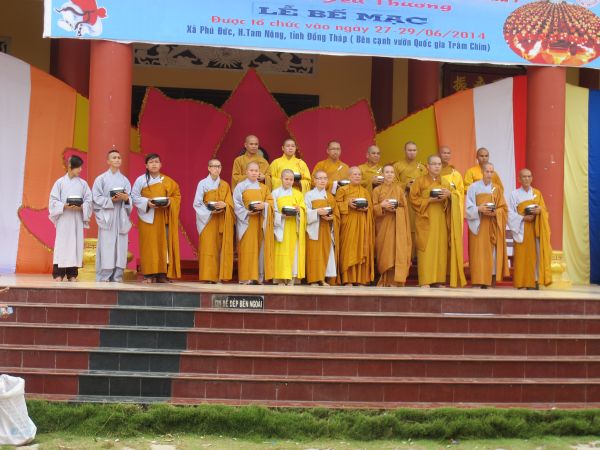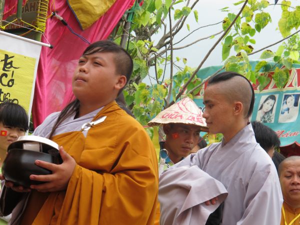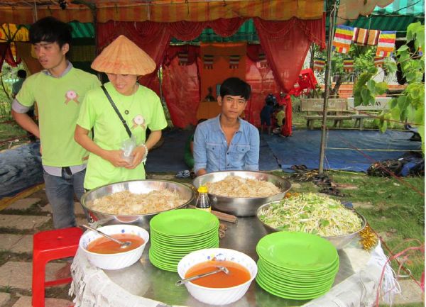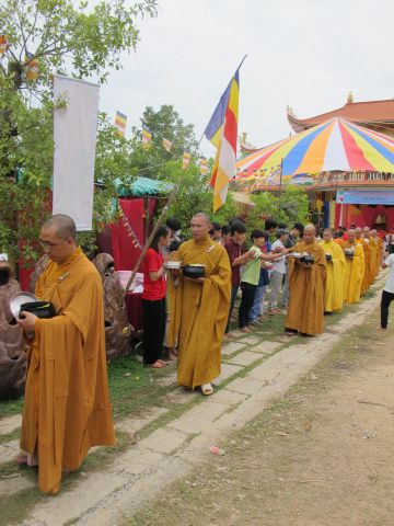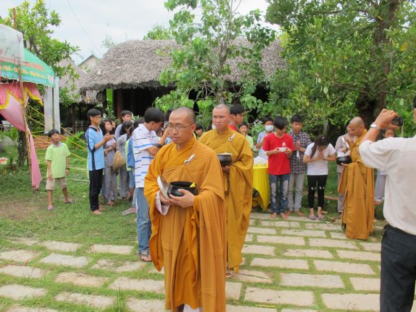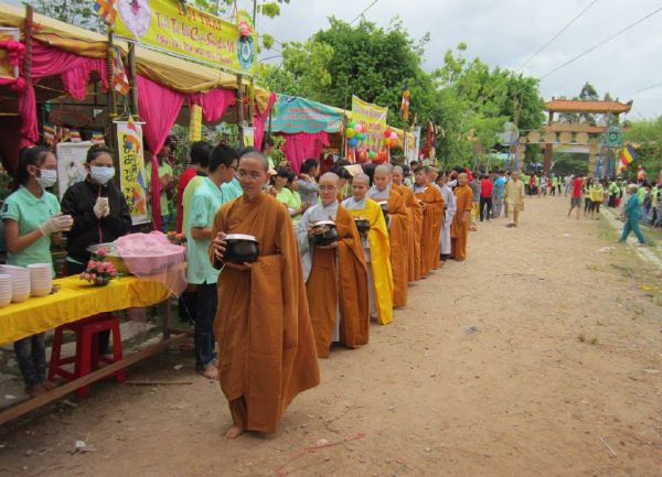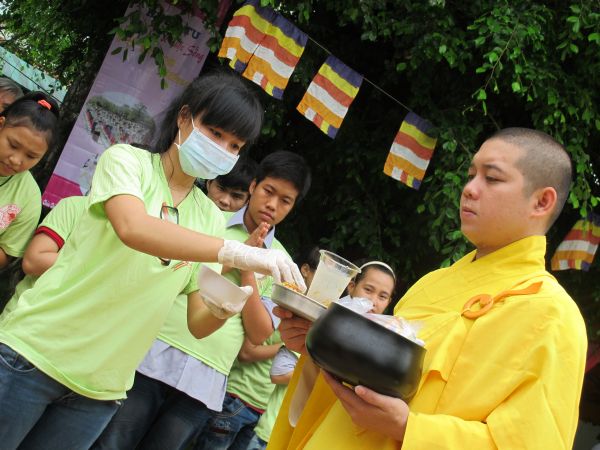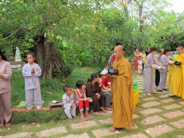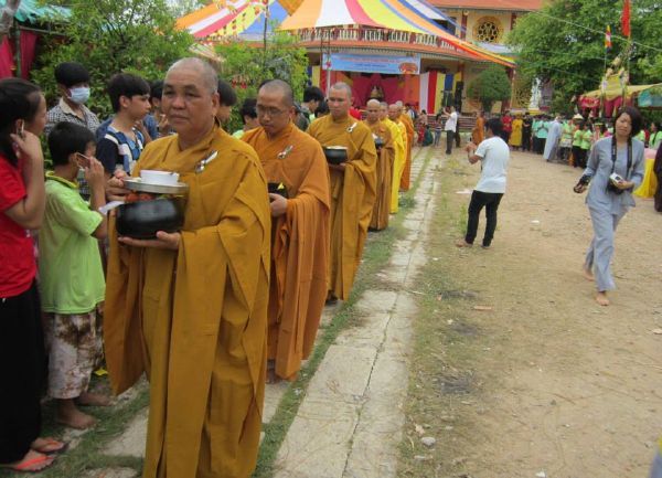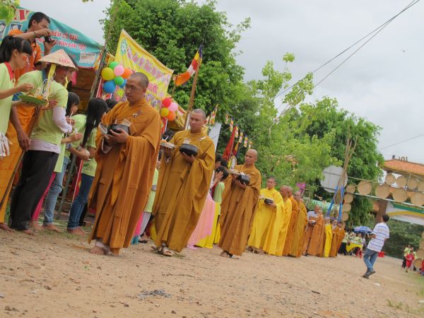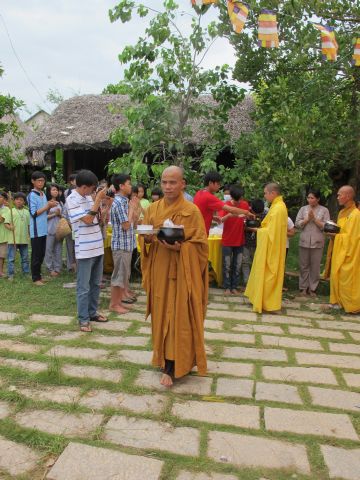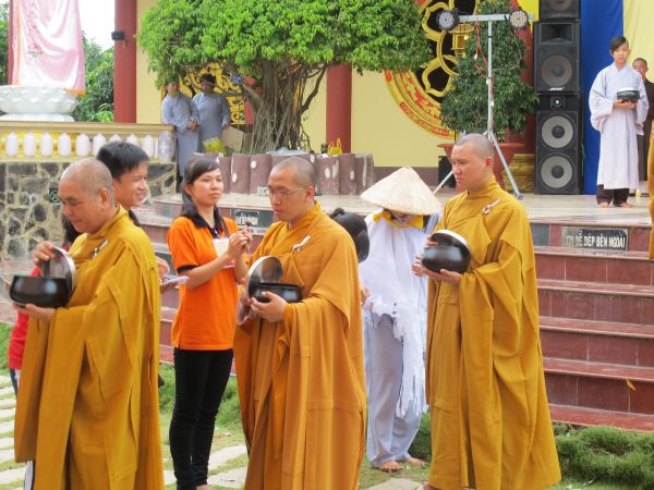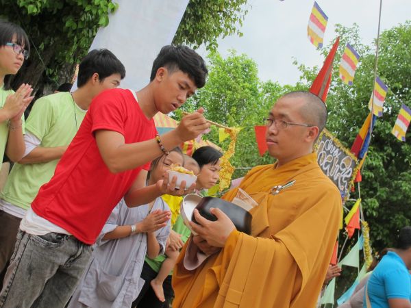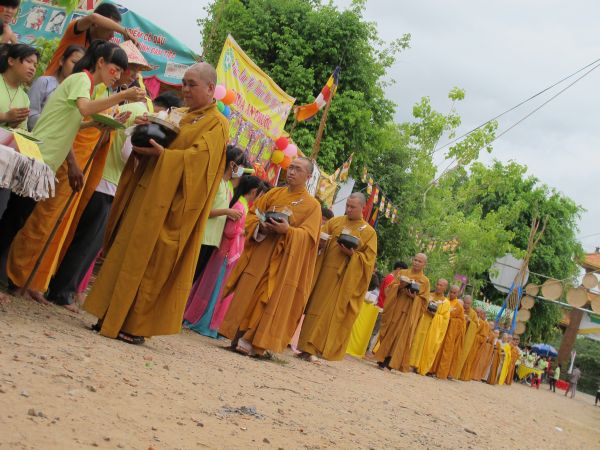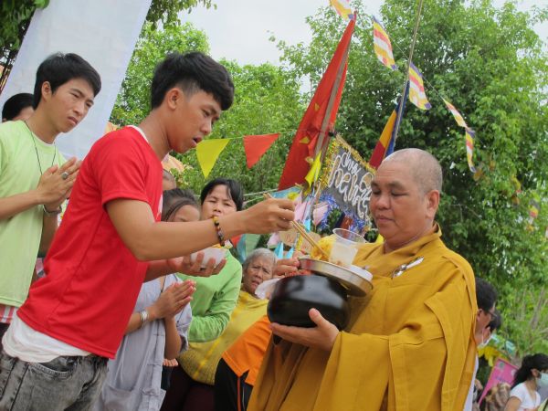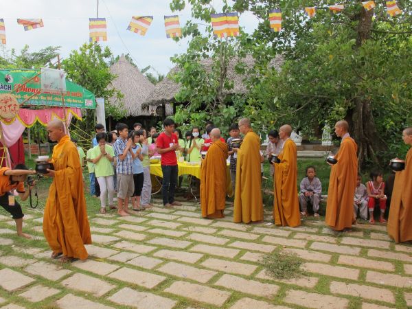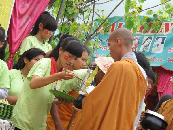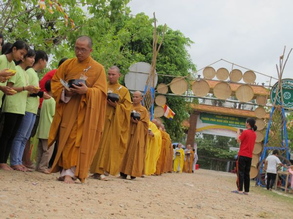 Trong khung cảnh trang nghiêm thanh tịnh, chư tôn đức Tăng Ni với dáng đi oai nghiêm, tĩnh tại giữa cái nắng gắt chói chang của mùa hè. Các bạn trẻ nghiêm trang chắp đôi bàn tay thành kính, cung nghinh đón chư tôn đức đến khất thực. Cầm trên tay với chiếc bình bát rỗng, chẳng mấy chốc lại đầy ấp vì các trại sinh đã thành kính cúng dường đến chư tôn đức. Đa phần, các món chay tại phiên chợ là những món ăn truyền thống, bổ dưỡng, dưới sự hỗ trợ của ban âm thực và các anh chị tình nguyện viên, các món ăn có nhiều màu sắc, tô thêm cho bức tranh phiên chợ quê hương trở nên sinh động.