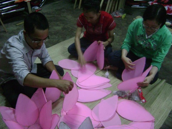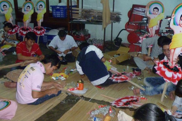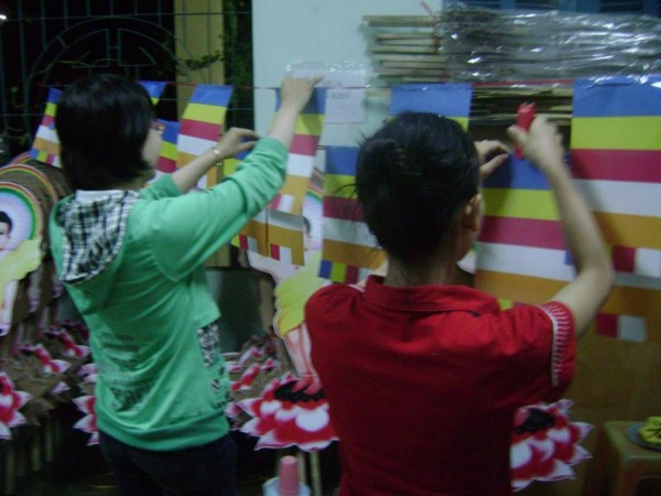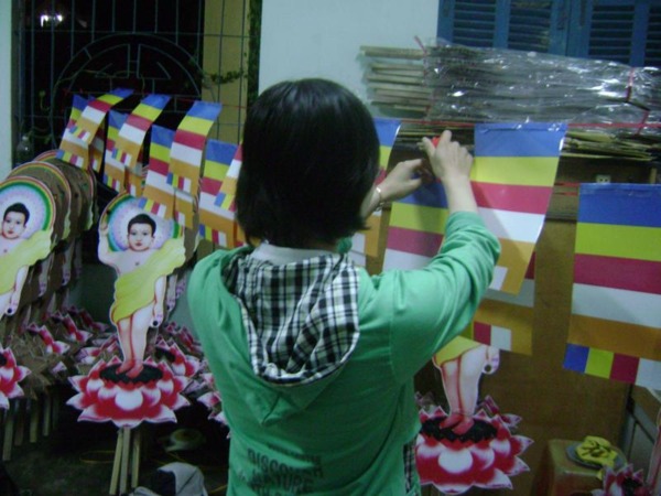 Ban ngày ai cũng bận việc ở cơ quan nên mỗi tối huynh đệ tranh thủ tập trung về Chùa để làm. Làm ra sản phẩm đã khó, vận động mọi người thỉnh về để cùng trang trí lại càng khó hơn. Mọi người vừa làm vừa động viên nhau, khuyến khích mỗi thành viên đạo tràng đều phải trang trí cho gia đình mình. Ngoài ra, huynh đệ cũng phải vận động đồng bào Phật tử trong xóm, trong khu phố hoặc xa hơn nữa cùng nhau treo tượng, băng rôn và cờ Phật Giáo. Còn một tháng nữa mới đến ngày đại lễ nhưng không khí mùa Phật Đản như đang nhen nhóm, rộn ràng đâu đây…