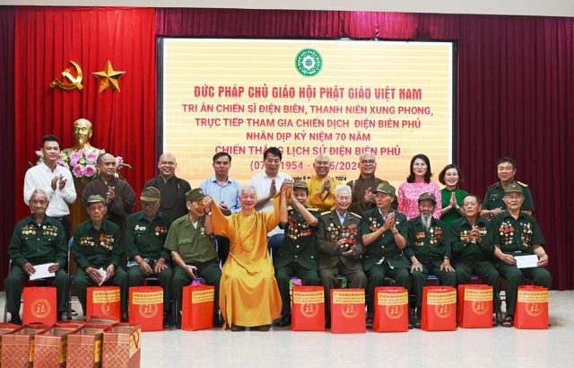 Đức Pháp chủ đã đích thân trao quà đến các cựu chiến binh là chiến sĩ, thanh niên xung phong trực tiếp tham gia Chiến dịch Điện Biên Phủ trong buổi gặp mặt tại hội trường TP.Điện Biên Phủ, mỗi phần gồm tịnh tài 2 triệu đồng và yến hộp, bánh dùng cho người cao niên.