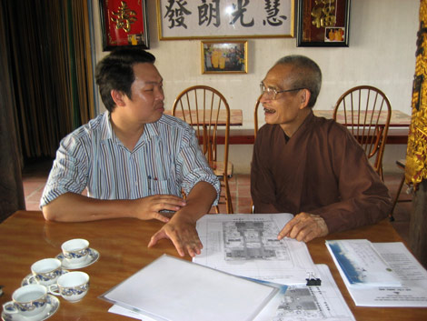 Đức Pháp chủ đang trao đổi với kiến trúc sư về bản vẽ xây dựng chùa