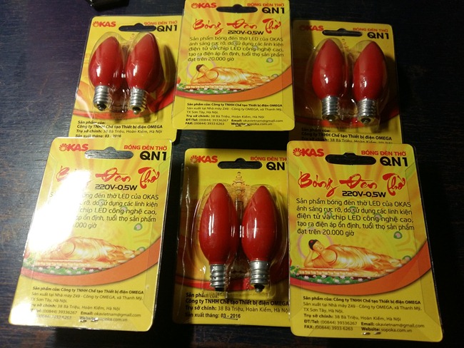 Hình Đức Phật Thích Ca nhập Niết Bàn in dưới câu quảng cáo “Sản phẩm bóng đèn thờ LED của OKAS ánh sáng rực rỡ, do sử dụng các linh kiện điện tử và chíp LED công nghệ cao, tạo ra điện áp ổn định, tuổi thọ sản phẩm đạt 20.000 giờ” trông thật mỉa mai, cay đắng cho người theo đạo Phật!