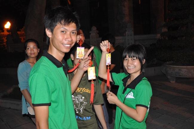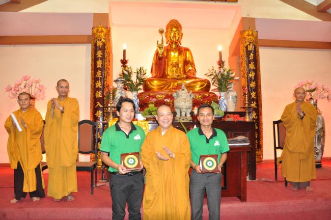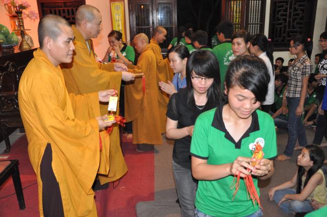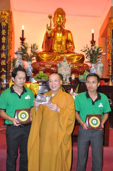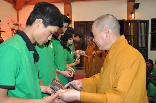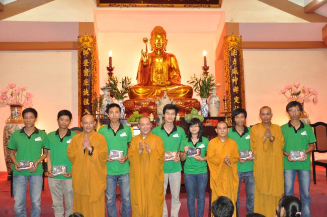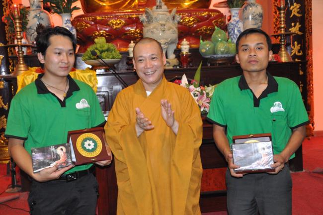 Sự thành công của đại lễ Phật đản lần này là sự đóng góp công sức của tất cả các thanh niên trẻ, và để khích lệ tinh thần các bạn – Thượng tọa cùng chư tôn đức đã trao tặng quà khích lệ tinh thần các bạn trẻ, một bức hình Đức Phật tiếp sức trợ lực cho các bạn trên mọi nẻo đường, để đi đâu cũng có Đức Phật và mẹ hiền Quan Thế Âm Bồ Tát chở che cho những người “mang sức trẻ làm lợi ích cho đời”.
