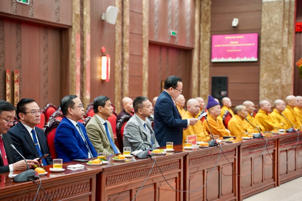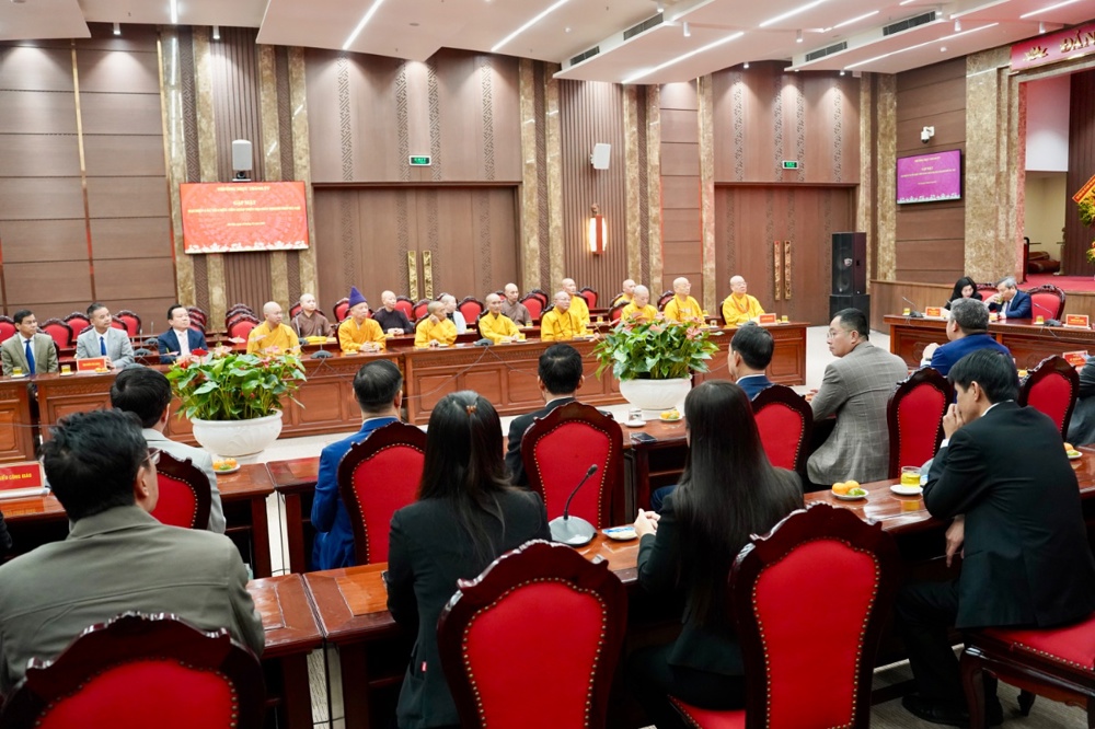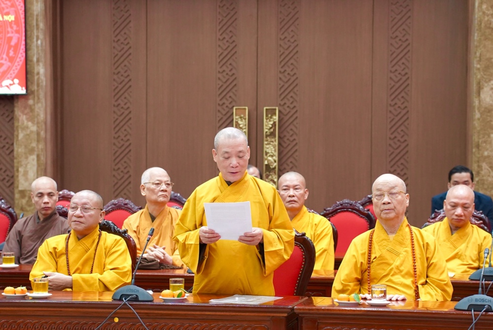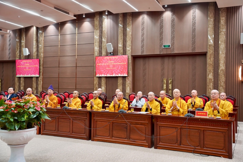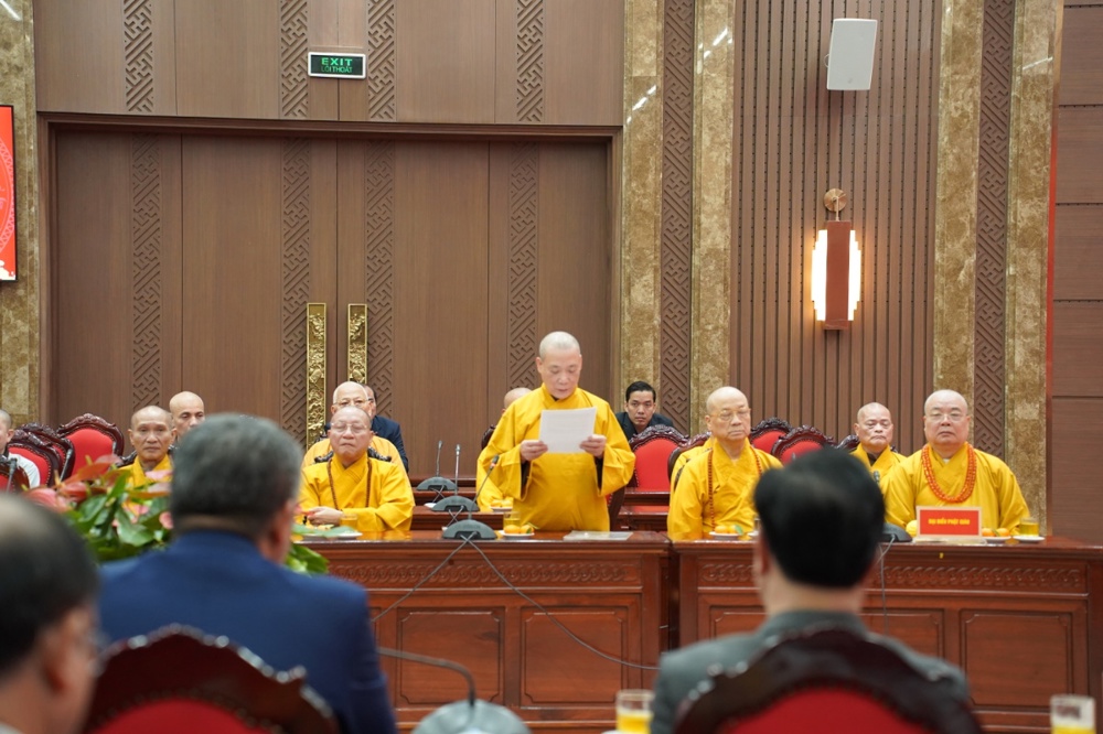 Phát biểu tại buổi gặp mặt, Hòa thượng Thích Bảo Nghiêm – Phó Chủ tịch HĐTS, Trưởng BTS GHPGVN thành phố Hà Nội bày tỏ lời tri ân sâu sắc tới Đảng bộ, chính quyền và nhân dân Thủ đô trong năm qua luôn tạo điều kiện để Phật giáo Thủ đô phát triển ổn định, đúng pháp luật, đóng góp tích cực vào khối đại đoàn kết toàn dân tộc. Phật giáo Việt Nam nói chung, trong đó có Phật giáo Thủ đô luôn ý thức rõ trách nhiệm của mình trong việc phát huy truyền thống đoàn kết, đồng hành cùng dân tộc; và khẳng định tiếp tục đồng hành cùng Đảng bộ, chính quyền các cấp của thành phố, phát huy tinh thần phụng sựđể Thủ đô Hà Nội trở thành nơi đáng sống, đáng tự hào của mỗi người dân.