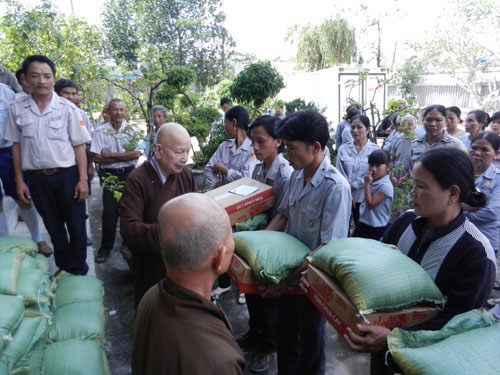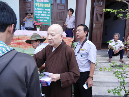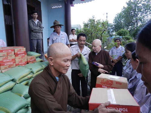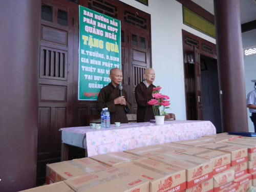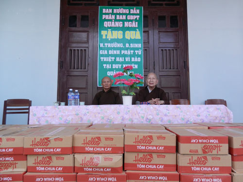 Nhằm góp phần xoa dịu nỗi đau và để cùng chia sẻ với Anh chị em LAM VIÊN vùng bão lũ, thực hành tinh thần “Lá lành đùm lá rách, lá rách ít đùm lá lá rách nhiều, một miếng khi đói bằng một gói khi no”, thể hiện hạnh nguyện từ bi của những người con Phật trong tổ chức ÁO LAM GĐPT Quảng Ngãi, nhờ sự trợ duyên của Ni sư Thích Nữ Như Tuấn, nhờ sự hỗ trợ giúp đở về phương tiện vận chuyển của gia đình anh chị Giác Hoa – Đồng Nhạn và anh Nhuận Kim, vào lúc 11 giờ ngày 31/10/ 2013 (nhằm ngày 27/9/ Quý Tỵ, Ban Hướng dẫn Phân ban Gia đình Phật tử Quảng Ngãi đã thăm hỏi, động viên và tặng 100 phần quà trị giá 25.000.000 đồng cho Huynh trưởng – Đoàn sinh các GĐPT thuộc huyện Duy Xuyên, huyện Điện Bàn và thành phố Hội An tỉnh Quảng Nam. Giá trị mỗi phần quà tuy nhỏ bé nhưng mang đầy ý nghĩa thể hiện sự cảm thông đối với Anh chị em vừa trải qua cơn thiên tai hoạn nạn.