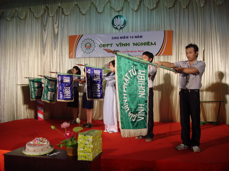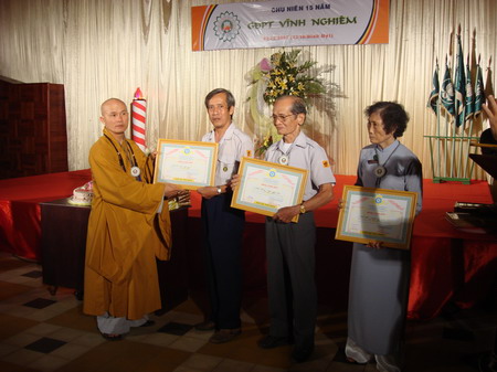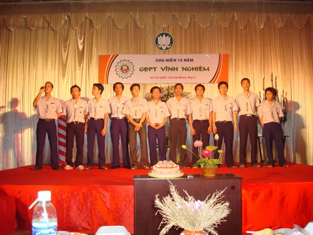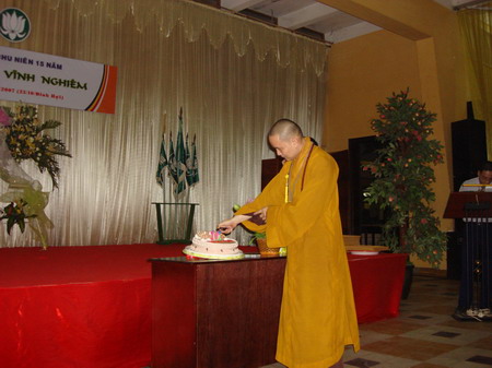 15 năm là 1 chặng đường mà GĐPT Vĩnh Nghiêm đã và đang thực hiện trên con đường phụng sự Phật pháp. Đại Đức cố vấn giáo hạnh Thích Giác Hiệp đã thắp nến cắt bánh chúc mừng lễ chu niên 15 năm. Thay mặt cho Thượng Tọa Trụ Trì và Chư Tăng Tổ Đình Vĩnh Nghiêm, TT.Thích Giác Dũng ban đạo từ đến với GĐPT Vĩnh Nghiêm nhân ngày lễ chu niên 15 năm. Thượng Tọa mong rằng các em đoàn sinh nói riêng và các quý Phật tử luôn ngày càng tinh tấn hơn nữa trong việc phụng sự đạo pháp, học hỏi nghiên cứu giáo lý Phật đà ngày càng hòan thiện, luôn tránh điều ác, tăng trưởng các điều lành, làm cho hạt giống bồ đề tâm ngày càng tăng trưởng.