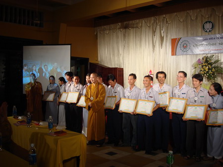TT. Thích Giác Dũng trao giấy tuyên dương công đức cho các huynh trưởng