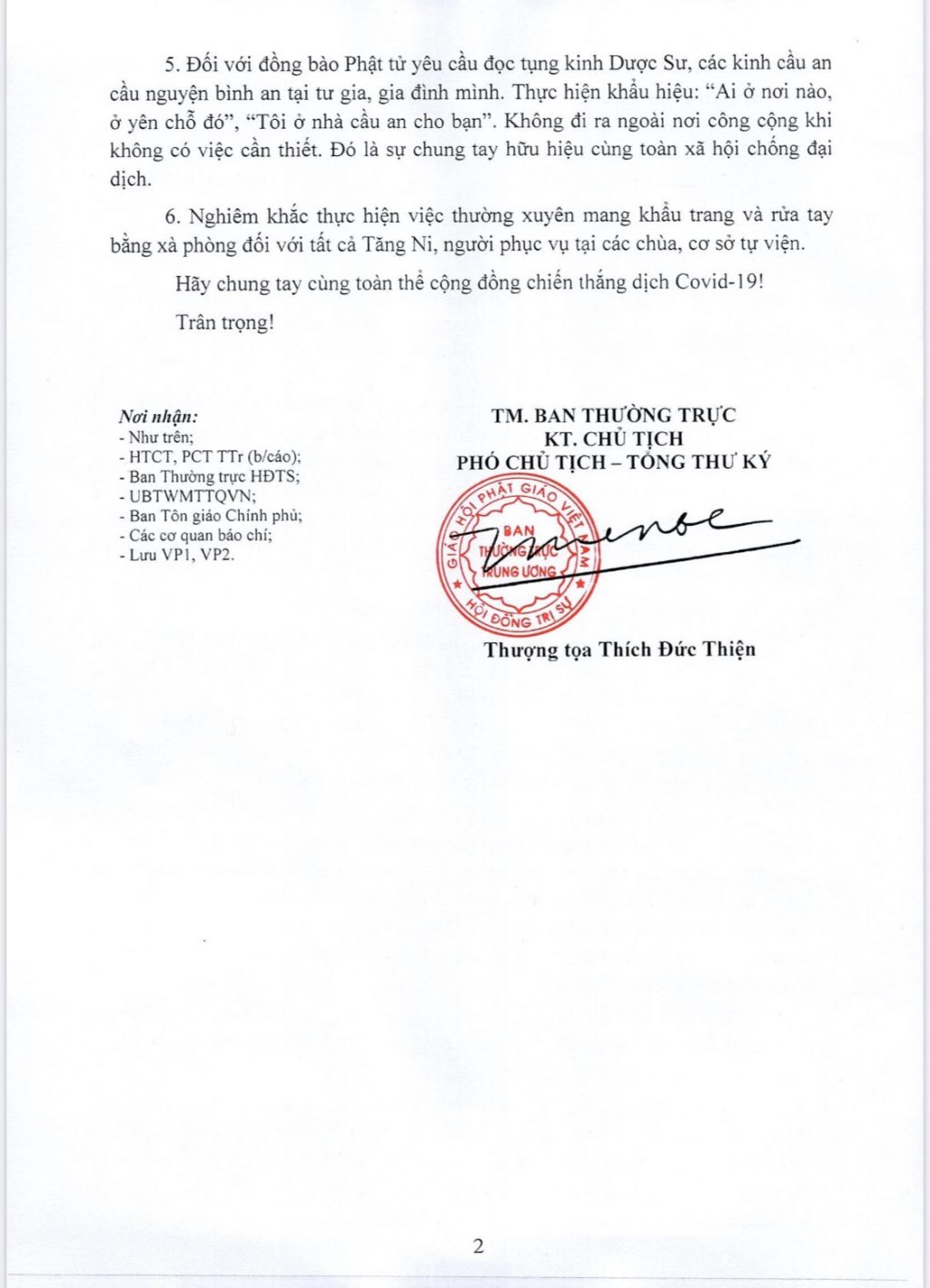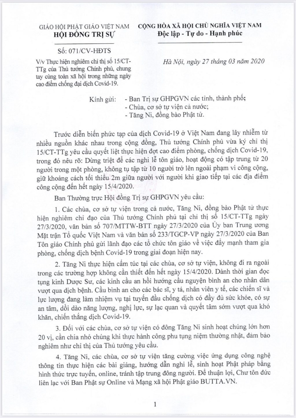Trước diễn biến phức tạp của dịch Covid-19 ở Việt Nam đang lây nhiễm từ nhiều nguồn khác nhau trong cộng đồng, Thủ tướng Chính phủ vừa ký chỉ thị 15/CT-TTg yêu cầu quyết liệt thực hiện đợt cao điểm phòng, chống dịch Covid-19. Hội đồng Trị sự GHPGVN đã ban hành Công văn số 071/CV-HĐTS ngày 27/3/2020 về việc thực hiện nghiêm chỉ thị của Thủ tướng Chính phủ, chung tay cùng toàn xã hội trong những ngày cao điểm chống đại dịch.