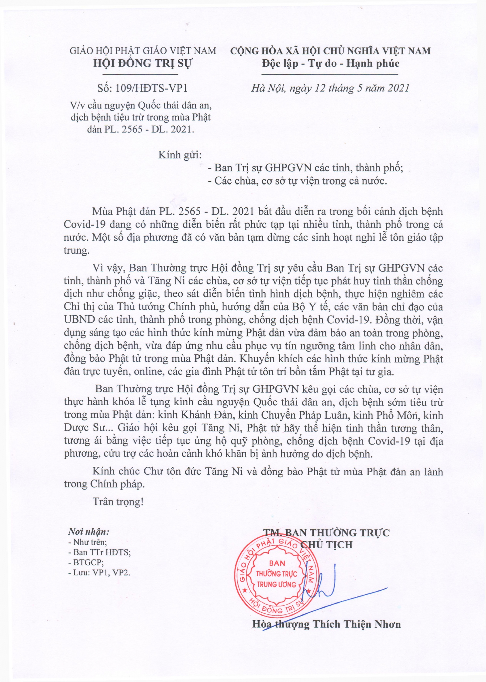 Hội đồng Trị sự Giáo hội Phật giáo Việt Nam (GHPGVN) vừa có Công văn số 109/HĐTS-VP1 gửi Ban Trị sự GHPGVN các tỉnh, thành phố, các chùa, cơ sở tự viên trong cả nước về việc cầu nguyện Quốc thái dân an, dịch bệnh tiêu trừ trong mùa Phật đản PL.2565 – DL. 2021.