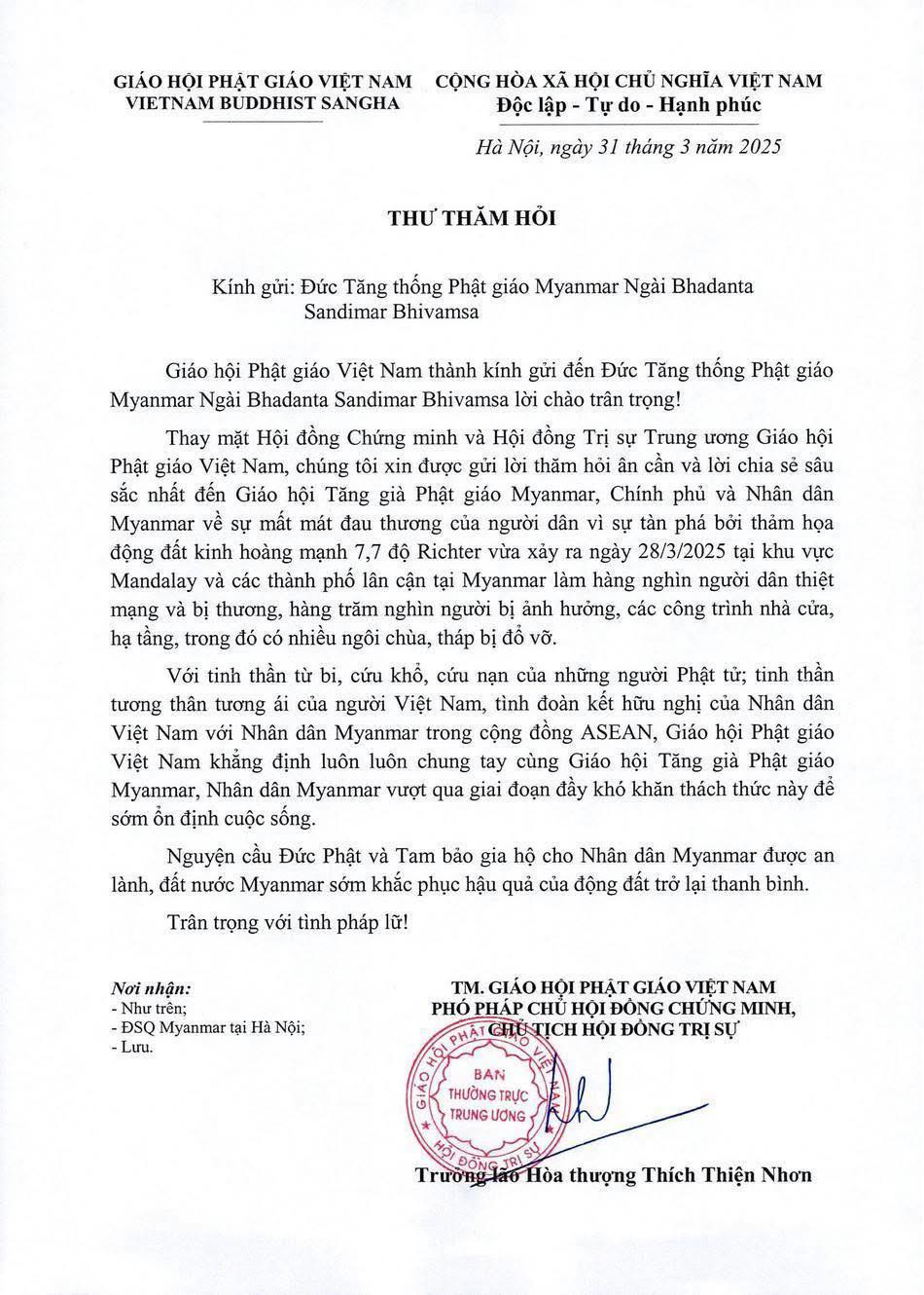 Thư thăm hỏi nêu rằng, thảm họa động đất kinh hoàng mạnh 7,7 độ Richter vừa xảy ra vừa qua tại khu vực Mandalay và các thành phố lân cận tại Myanmar làm hàng nghìn người dân thiệt mạng và bị thương, hàng trăm nghìn người bị ảnh hưởng, các công trình nhà cửa, hạ tầng, trong đó có nhiều ngôi chùa, tháp bị đổ vỡ.