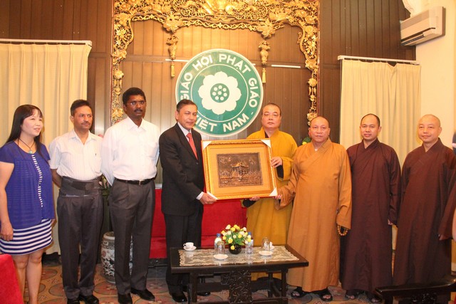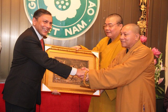 Cuối buổi gặp mặt chư Tôn đức GHPGVN tặng quà lưu niệm tới Ngài Ngài Đại sứ Ranjit Rae.