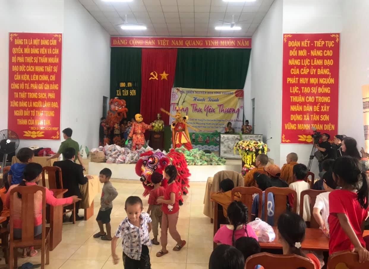 Sáng ngày 27/09/2020 ( ngày 11 tháng 8 ÂL ): Tại Nhà Văn Hóa xã Tân Sơn, Pleiku, Hội đã tổ chức Vui Tết Trung Thu và tặng quà cho 300 em thiếu nhi Làng Tiên về nhà Văn Hóa. Chương trình dưới sự chứng minh của Thượng tọa Thích Giác Hiền-Phó trưởng BTS, kiêm Trưởng Ban Văn Hóa GHPGVN tỉnh Gia Lai, Đại đức Thích Giác Minh Nguyên -Tăng chúng tịnh xá Ngọc Cổ, Pleiku, tỉnh Gia Lai, và sự tham dự của ông Phạm Văn Hiến-Bí thư Đảng Ủy xã Tân Sơn, TP,Pleiku, Ông Lê Xuân Dũng-Phó chủ tịch UBND xã Tân Sơn., các vị đại diện Đảng Ủy HĐND, UBND và Ủy ban MTTQ VN xã Tân Sơn. Chương trình với biểu diễn múa Lân và các tiết mục Chú Cuội & Chị Hằng và giao lưu văn nghệ do các em thiếu nhi Làng Tiên và thành viên Hội Thiện Nguyện Hoa Tình Thương góp vui cho chương trình. Mỗi phần quà gồm : Lồng đèn, bánh Trung Thu, sữa, tập vỡ, bánh kẹo,..