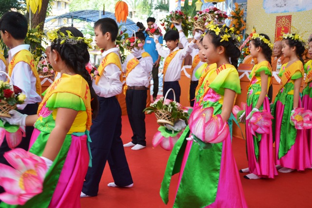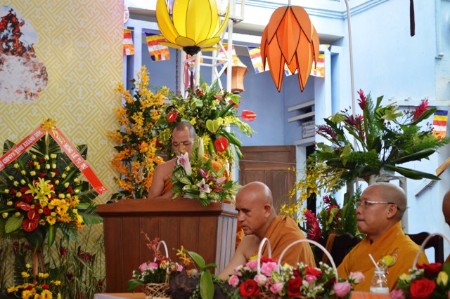 Nhân dịp này, cư sĩ Thiện Mỹ và Ngọc Liên thay mặt cho hàng phật tử dâng lời cảm niệm về ân đức Tam bảo và sanh thành dưỡng dục của Mẹ Cha nhân mùa Vu lan báo hiếu mà người con Phật có cơ duyên được tiếp cận và nương mình theo tu học.. Lễ Cài hoa Hồng diễn ra trong không khí tôn nghiêm lắng đọng “Hoa hồng vàng dâng Phật, pháp, Tăng. Hồng đó dâng Mẹ và Cha đang còn. Hồng trắng tủi phận đàn con. Côi cút Mẹ hiền lại còn xót xa”.