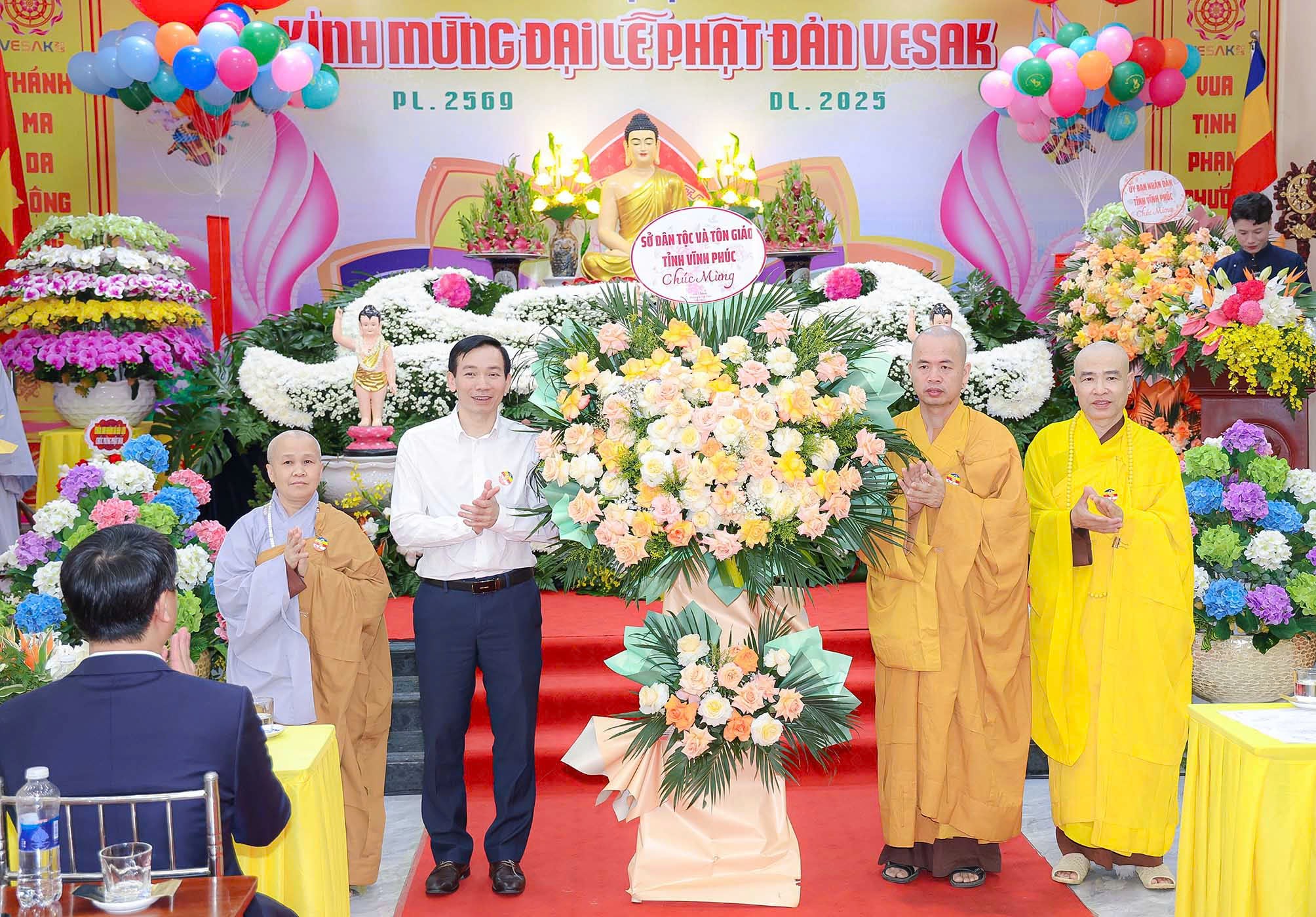 Thay mặt Tỉnh ủy, HĐND, UBND, Ủy ban MTTQ tỉnh, Phó Chủ tịch UBND tỉnh Nguyễn Khắc Hiếu tặng lẵng hoa tươi thắm chúc mừng Chư Tôn Đức Tăng, Ni; Ban Trị sự Giáo hội Phật giáo Việt Nam tỉnh Vĩnh Phúc cùng bà con phật tử đón mùa Phật đản, Phật lịch hoan hỉ, an vui, hạnh phúc.