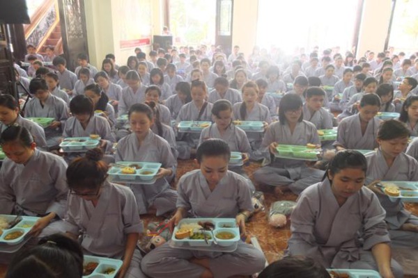 12h15: Ngồi thiền rải tâm từ bi và trì chú Bồ Tát Đại Bi Quan Thế Âm “Om Mani Padme Hum”, Bồ Tát Đại Trí Văn Thù “Om Ah Ra Pa Tsa Na Dhi”. Sau khi ngồi thiền xong, tu sinh dùng cơm trưa trong chánh niệm.