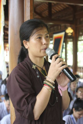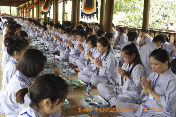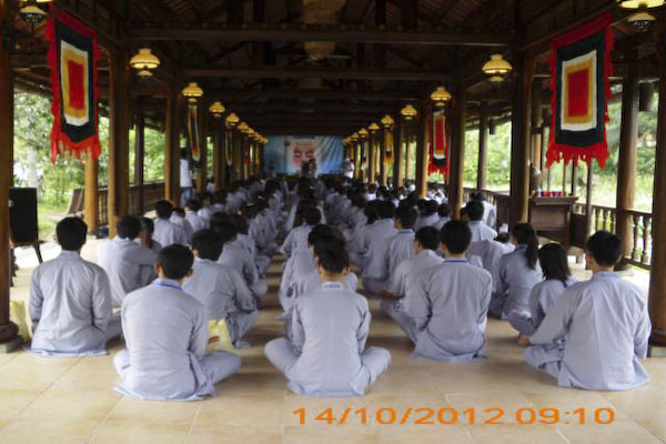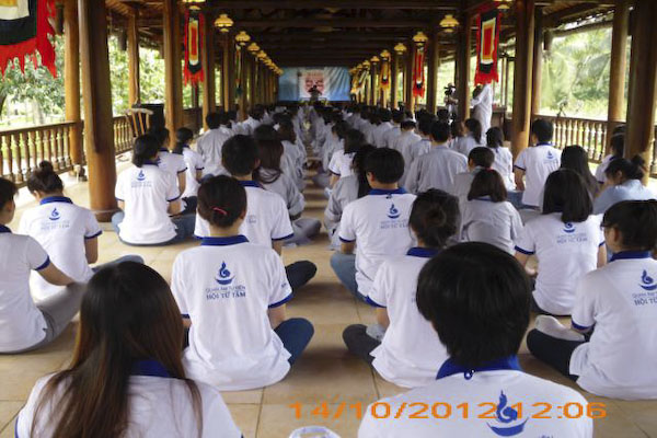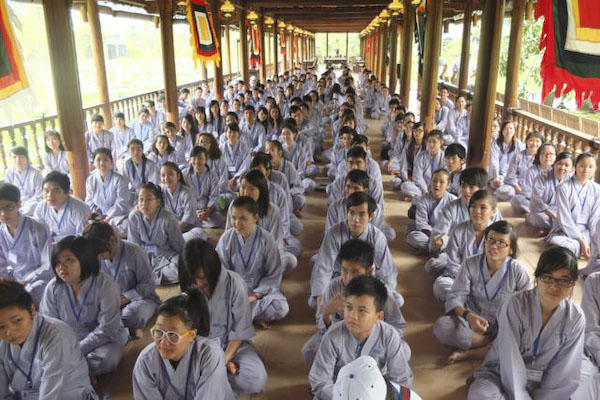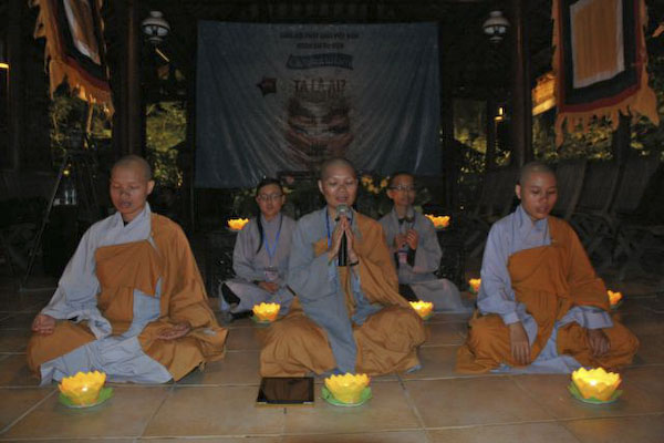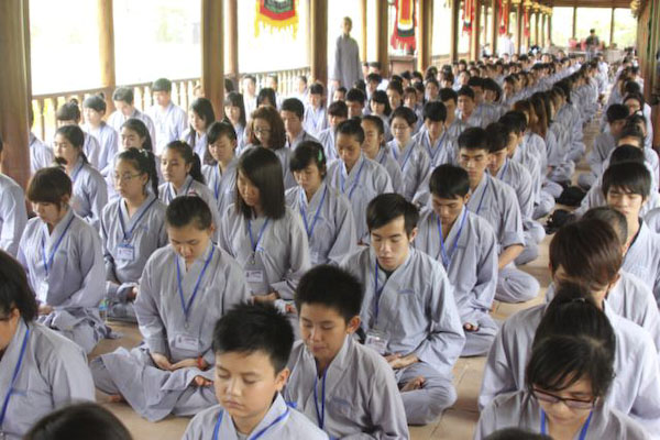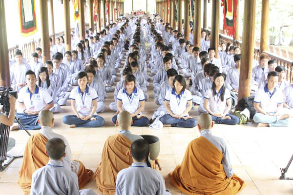 Sau phần vấn đáp, sư cô Huệ Đức hướng dẫn các bạn trẻ tập ngồi thiền rải tâm từ bi và trì chú, tạo nên khoảnh khắc thật bình yên và tất cả dường như chìm vào trong không gian yên bình đó xen kẽ cảm giác mới mẻ và khá lạ lẫm đối với những em lần đầu tiên tham dự khóa tu.