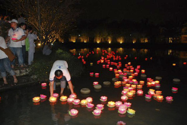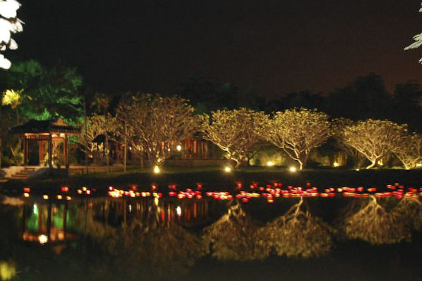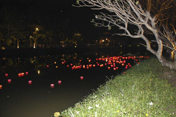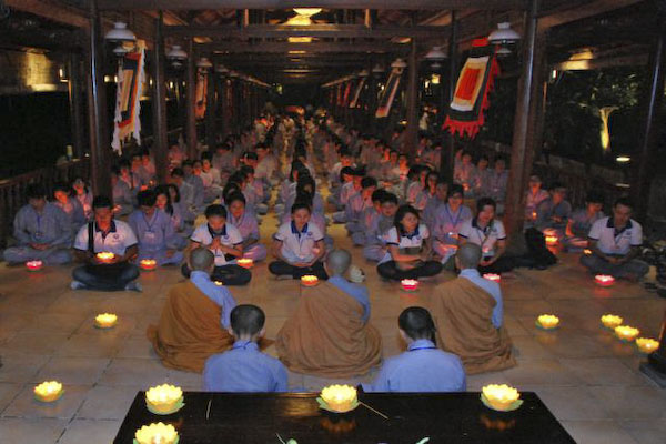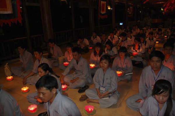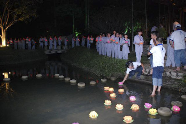 19h30: Lễ hoa đăng & nhiễu đăng: Mỗi bạn trẻ cầm trên tay một ngọn đèn hoa đăng, sau nghi lễ hoa đăng, các em xếp thành hàng dài vừa đi vừa trì chú từ nhà thiền ra đến hồ Chân Lạc thả đèn xuống hồ. Những ngọn tuệ đăng tỏa sáng lung linh trên mặt hồ giữa bầu trời đêm tịch mịch – tạo cho chúng tôi cảm nghĩ đúng là những ngọn tuệ đăng đưa chúng sanh vượt sông mê.
