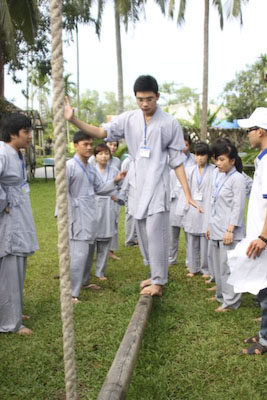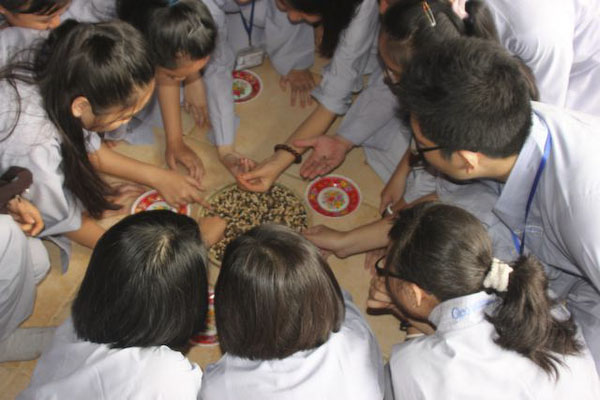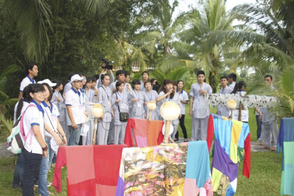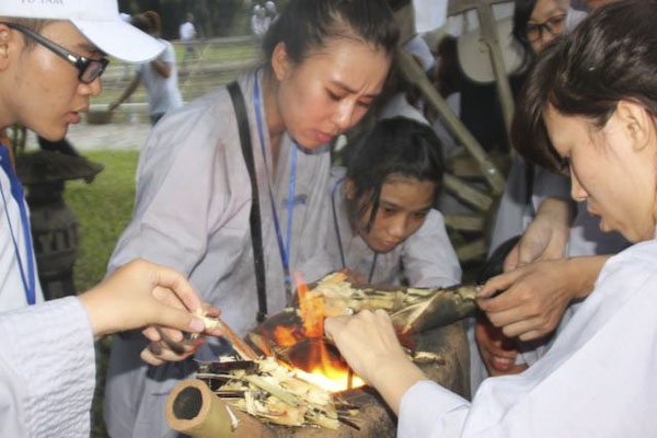 14h55: Các bạn tham gia các trò chơi như: Ngồi thiền bất động trong vòng 10 phút, lựa đậu trì chú, kế tiếp là các trò chơi dân gian như: qua cầu khỉ hái chuối, thảy vòng may mắn, cùng nhau vào bếp, (nướng bắp bằng xác mía tươi), đi tìm báu vật (tìm kẹo bằng miệng trong dĩa bột) vv…
