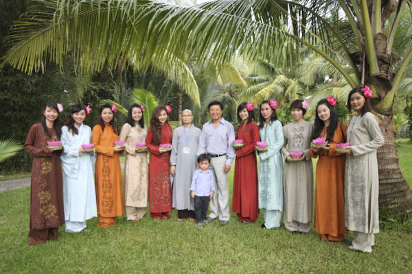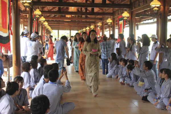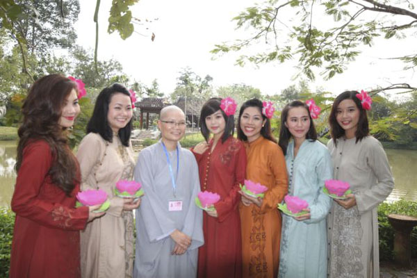 13h50: Các bạn trẻ giao lưu cùng trò chuyện với nhà thiết kế áo dài Sĩ Hoàng, cuộc trò chuyện kéo dài một tiếng – xung quanh vấn đề về “Mỹ thuật và Phật giáo”. Theo nhà thiết kế định nghĩa,: “Đẹp” có nghĩa là “Đẹp”, và đời “Đẹp” hơn nhờ có “Đạo”. Giá trị của một con người khi sống là làm việc tạo nên những giá trị thiết thực nhất cho đời và đạo (dù đó là điều nhỏ bé nhất – tùy theo khả năng và điều kiện bạn có đến đâu thì làm đến đó). Trong dịp này – các bạn trẻ cũng được xem trình diễn bộ sưu tập áo dài “Thiền Sen” của nhà thiết kế Sĩ Hoàng (do các bạn tình nguyện viên và tu sinh trình diễn). Bộ sưu tập này được thiết kế từ ý tưởng trong lúc nhà thiết kế ngồi thiền trong một khóa tu thiền Vipassana và được dựa trên nền tảng của những chiếc áo tràng của người Phật tử và tà áo dài Việt Nam. Bộ sưu tập ra đời là món quà của một nhà thiết kế Phật tử dành tặng cho những nữ Phật tử đi tới chùa lễ Phật trong một trang phục vừa trang nghiêm vừa đẹp mắt.
