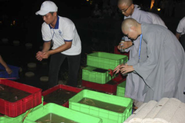 18h00: Hơn 300 tu sinh và gần 100 tình nguyện viên tập trung tại hồ Chân Lạc làm lễ tụng kinh cầu an và thả cá phóng sinh.