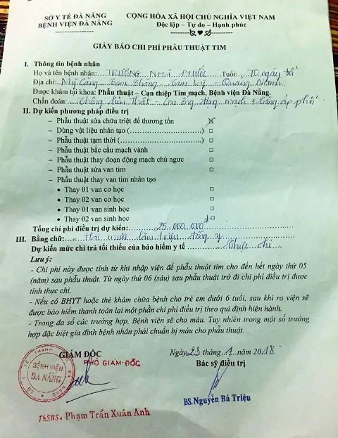 Mẹ cháu Phước, chị Nguyễn Thị Lan, (thôn Mỹ Cang, xã Tam Thăng, Tp.Tam Kỳ, tỉnh Quảng Nam) cho biết, các bác sĩ ở bệnh viện đa khoa TP.Đà Nẵng nói, cháu phải trải qua 4 lần phẫu thuật mới tạm ổn. Trong thời gian đợi cháu cân nặng đủ 6kg thì sẽ thực hiện ca mổ đầu tiên với số tiền phẫu thuật khoảng hơn 30 triệu đồng/mỗi lần phẫu thuật.