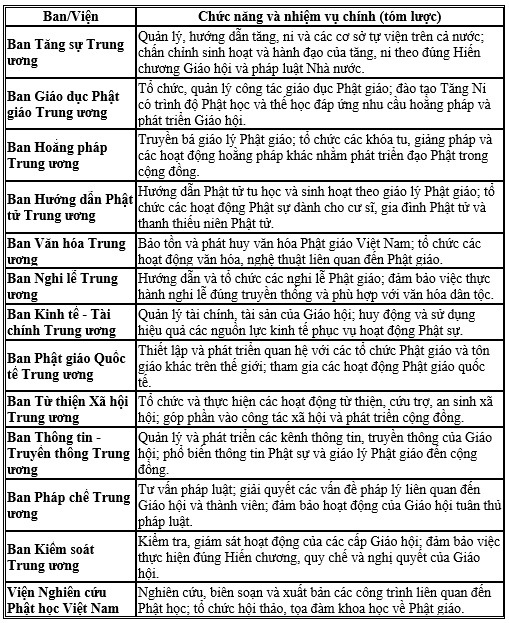 Dưới đây là bảng tóm tắt chức năng và nhiệm vụ chính của 13 Ban, Viện Trung ương thuộc Giáo hội Phật giáo Việt Nam: