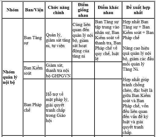 Hợp nhất Ban Tăng sự + Ban Kiểm soát + Ban Pháp chế: Cùng liên quan đến công tác quản lý nội bộ, thanh tra và pháp lý.