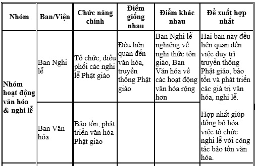Hợp nhất Ban Nghi lễ + Ban Văn hóa: Cả hai đều liên quan đến việc bảo tồn truyền thống và tổ chức các hoạt động nghi lễ Phật giáo.