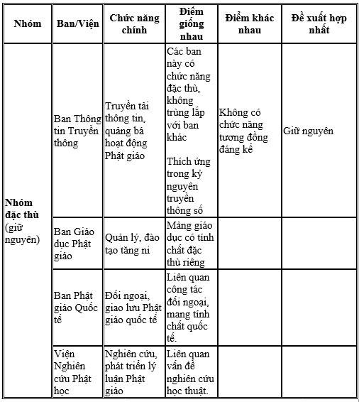 + Hiện nay, mỗi ban đại diện cho một lĩnh vực quan trọng trong GHPGVN. Nếu hợp nhất, liệu các lĩnh vực này có bị xem nhẹ? Thực tế, việc hợp nhất không làm mất đi tính đại diện mà giúp tổ chức vận hành hiệu quả hơn, tránh tình trạng phân tán nguồn lực. Ví dụ, Ban Hoằng pháp và Ban Hướng dẫn Phật tử khi hợp nhất có thể xây dựng chương trình giảng dạy đồng bộ hơn thay vì hoạt động riêng lẻ.