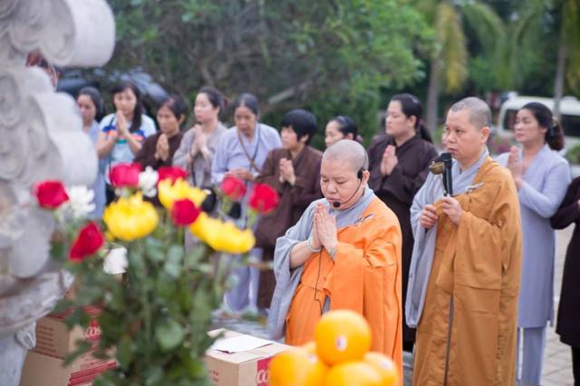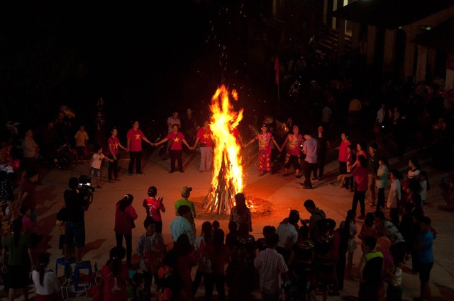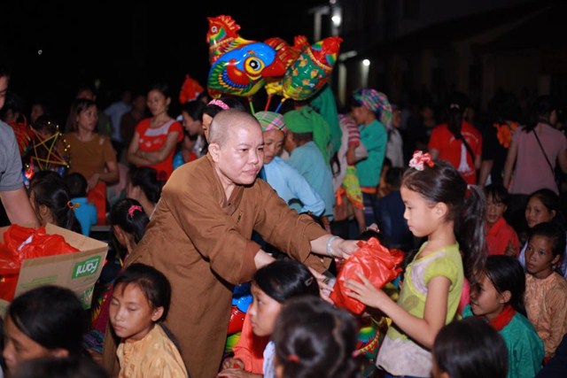 Trước khi đêm văn nghệ khép lại, chư tôn đức Ni, các Phật tử, các nhà hảo tâm đã phát quà, bánh kẹo, bóng hình con giống cho các em nhỏ và tổ chức đốt lửa trại trong không khí hoan hỷ, đoàn kết, ấm tình đạo vị.