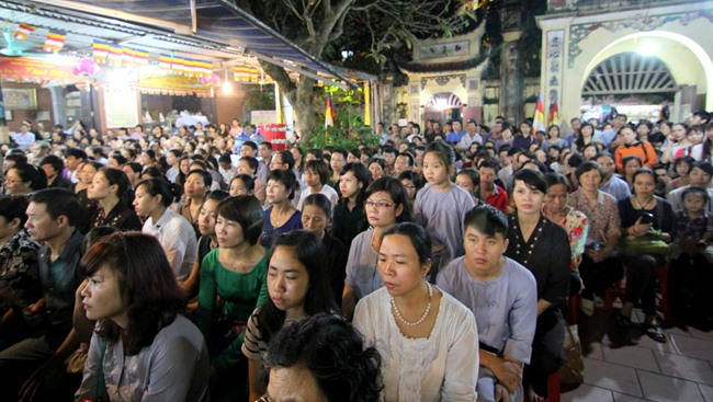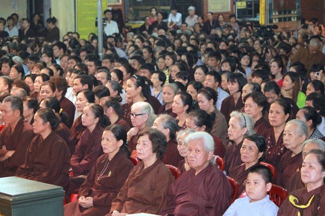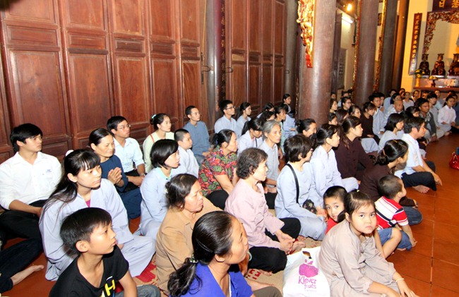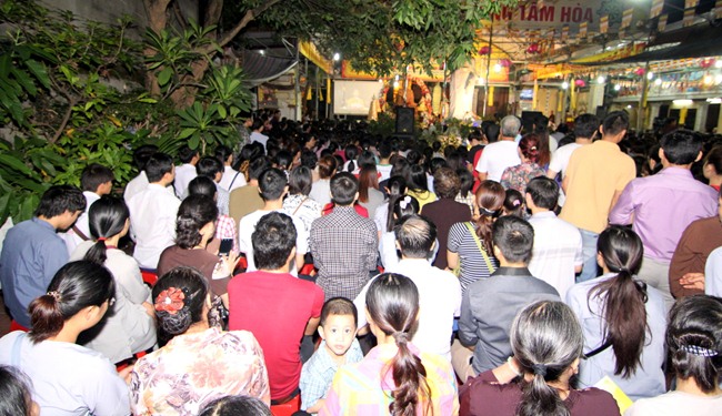 Đúng 18h00”, nhà chùa tổ chức Lễ Quy Y cho gần 500 thiện nan tín nữ phát tâm trở thành đệ tử Phật. Tại Chánh điện, buổi Lễ truyền giới chính thức diễn ra trong không khí trang nghiêm thanh tịnh. ĐĐ Thích Nghiêm Giám thay mặt thầy Bổn sư là TT Thích Chân Quang giảng giải về ý nghĩa Tam quy – ngũ giới của người phật tử tại gia. Và để Phật pháp năng động, mạnh mẽ hơn, đem lại lợi ích phước báo vô lượng cho người tu tập, Đại đức còn khuyến tấn phật tử hành trì thêm bảy điều nguyện trong đời sống hàng ngày, đó là: tập ăn chay, học Pháp, thực hành tu tập, làm việc từ thiện, phật hóa gia đình, phổ biến giáo Pháp và kiên cường hộ đạo. Sau đó, các phật tử theo sự hướng dẫn của quý thầy, phát nguyện sống trọn đời theo lời Phật dạy.
