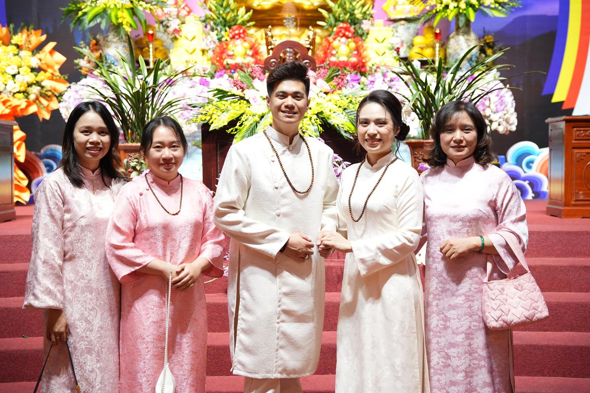 Trước Phật đài trang nghiêm, sáu đôi bạn trẻ: Bùi Huy Công – pháp danh Minh Thành và Phan Minh Hằng – pháp danh Vạn Nhiên; Nguyễn Duy Hùng – Pháp danh Minh Đại và Phan Ánh Ngọc – pháp danh Diệu Bảo; Vũ Đặng Minh Anh – Pháp danh Minh Trí và Ngô Thuỳ Dương – Pháp danh Diệu Tuệ; Lê Anh Tuyên – Pháp danh Minh Khánh và Lưu Hồng Hoa – Pháp danh Diệu Đức; Lê Quốc Phong – Pháp danh Minh Thanh và Trần Thị Huệ Phương – Pháp danh Diệu Hương; Nguyễn Quý Vinh – Pháp danh Trí Vinh và Nguyễn Thị Nhi – Pháp danh Tịnh Nhi đã nên duyên vợ chồng.