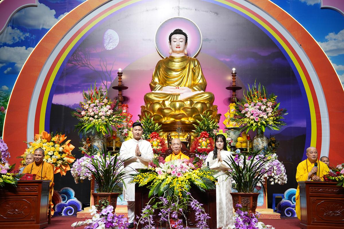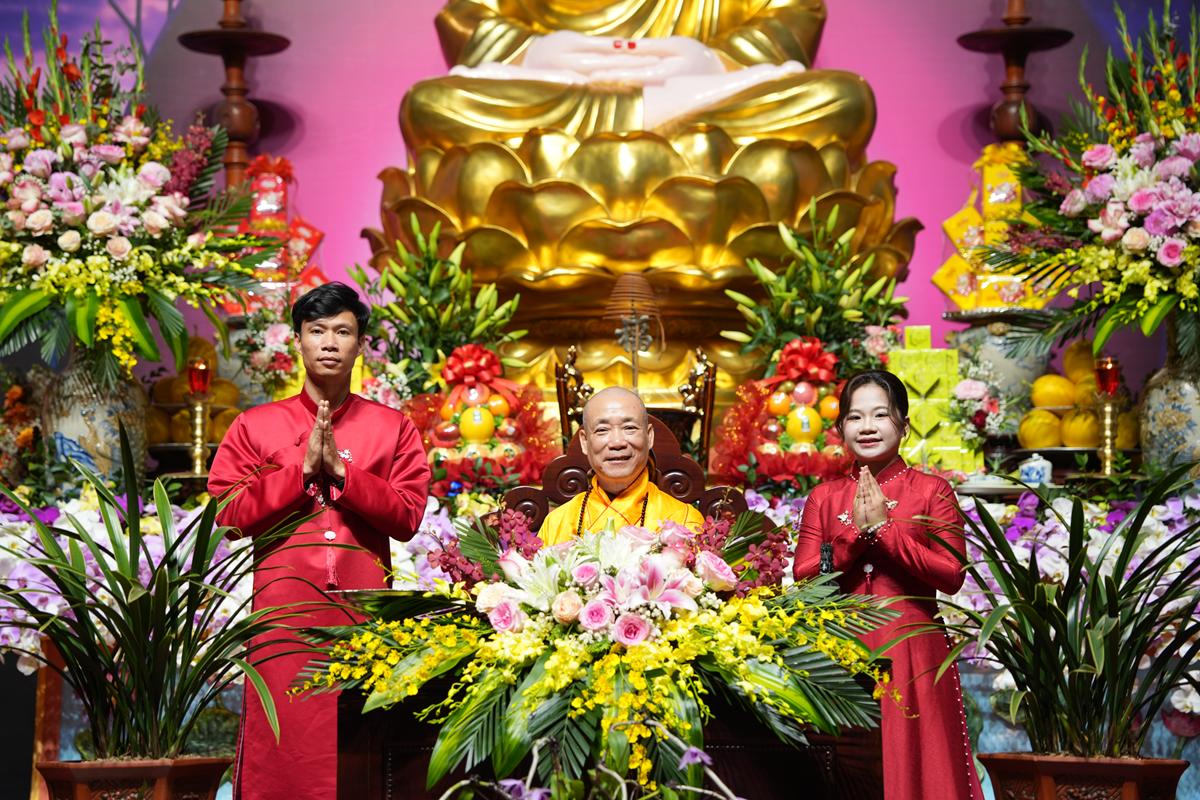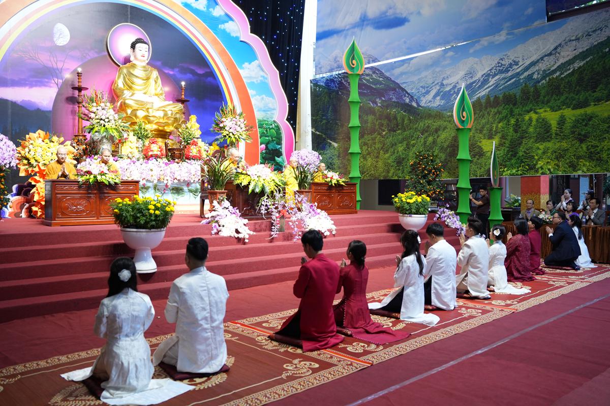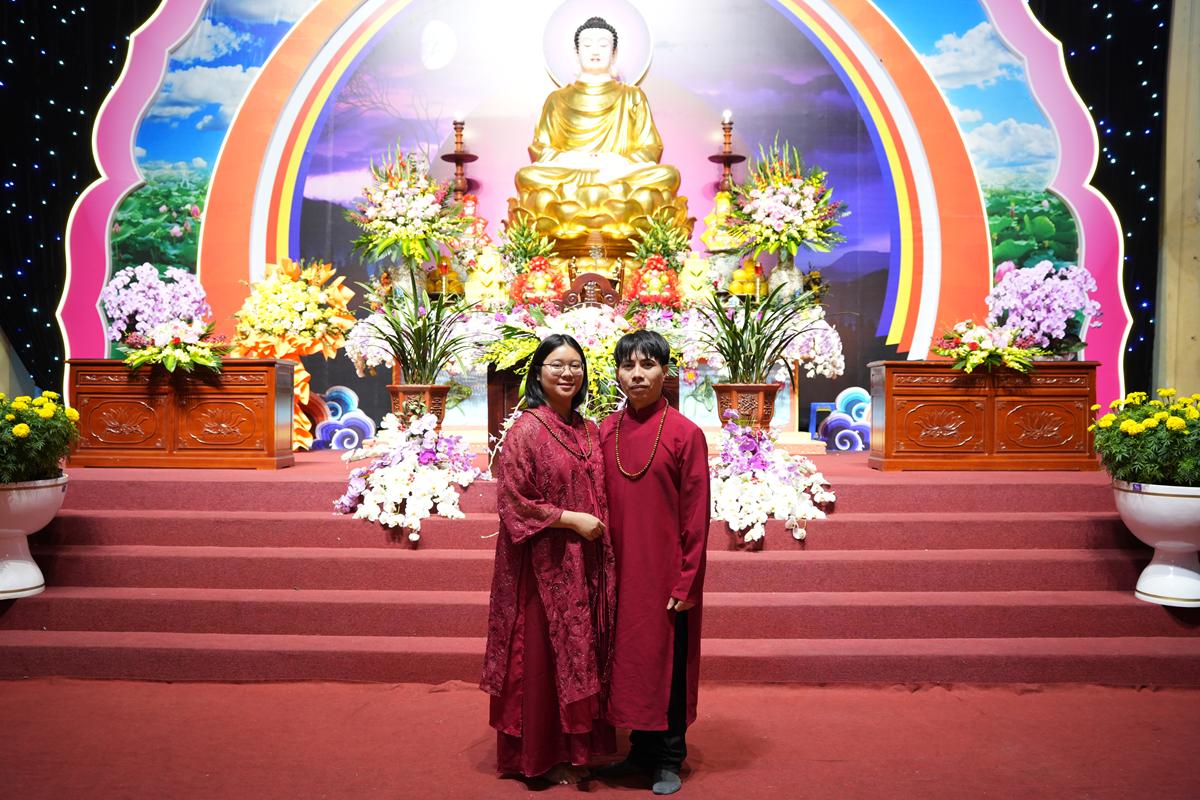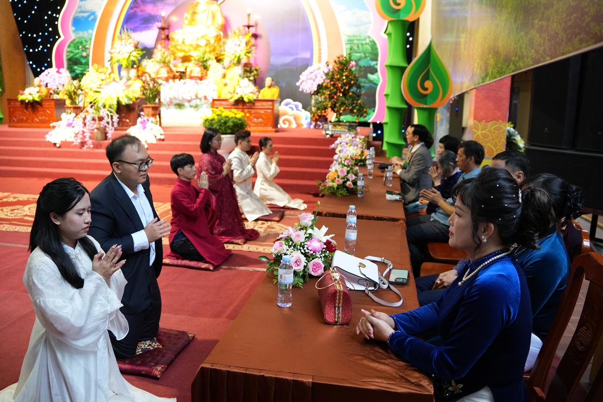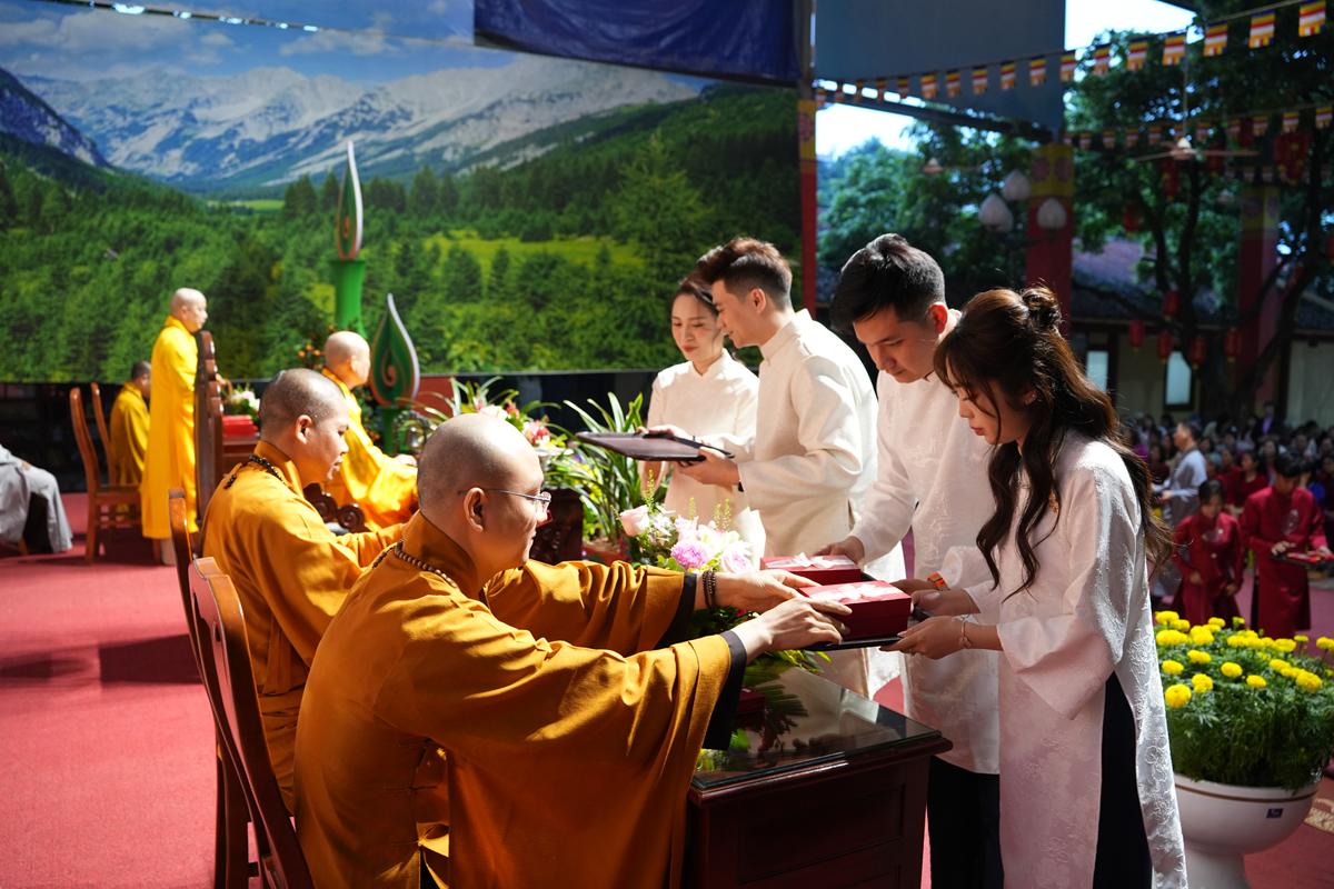 Trước Phật đài trang nghiêm, sáu đôi bạn trẻ: Bùi Huy Công – pháp danh Minh Thành và Phan Minh Hằng – pháp danh Vạn Nhiên; Nguyễn Duy Hùng – Pháp danh Minh Đại và Phan Ánh Ngọc – pháp danh Diệu Bảo; Vũ Đặng Minh Anh – Pháp danh Minh Trí và Ngô Thuỳ Dương – Pháp danh Diệu Tuệ; Lê Anh Tuyên – Pháp danh Minh Khánh và Lưu Hồng Hoa – Pháp danh Diệu Đức; Lê Quốc Phong – Pháp danh Minh Thanh và Trần Thị Huệ Phương – Pháp danh Diệu Hương; Nguyễn Quý Vinh – Pháp danh Trí Vinh và Nguyễn Thị Nhi – Pháp danh Tịnh Nhi đã nên duyên vợ chồng.