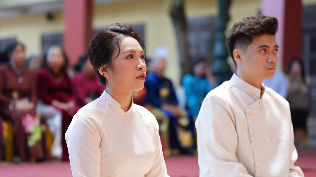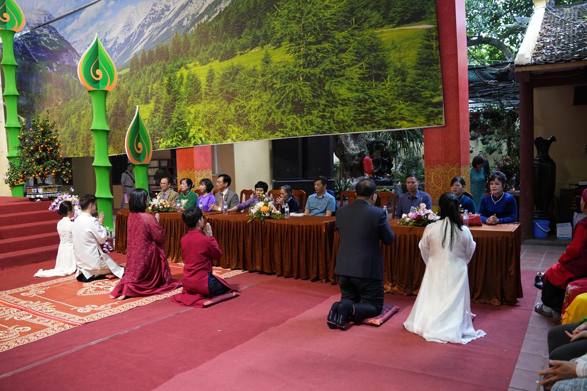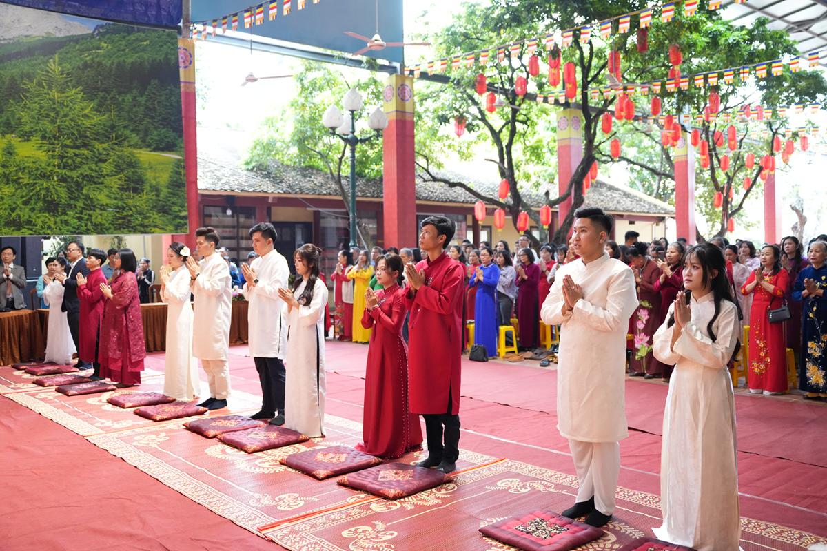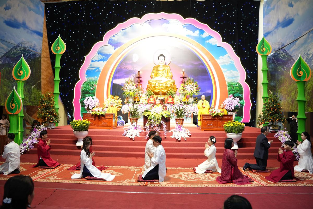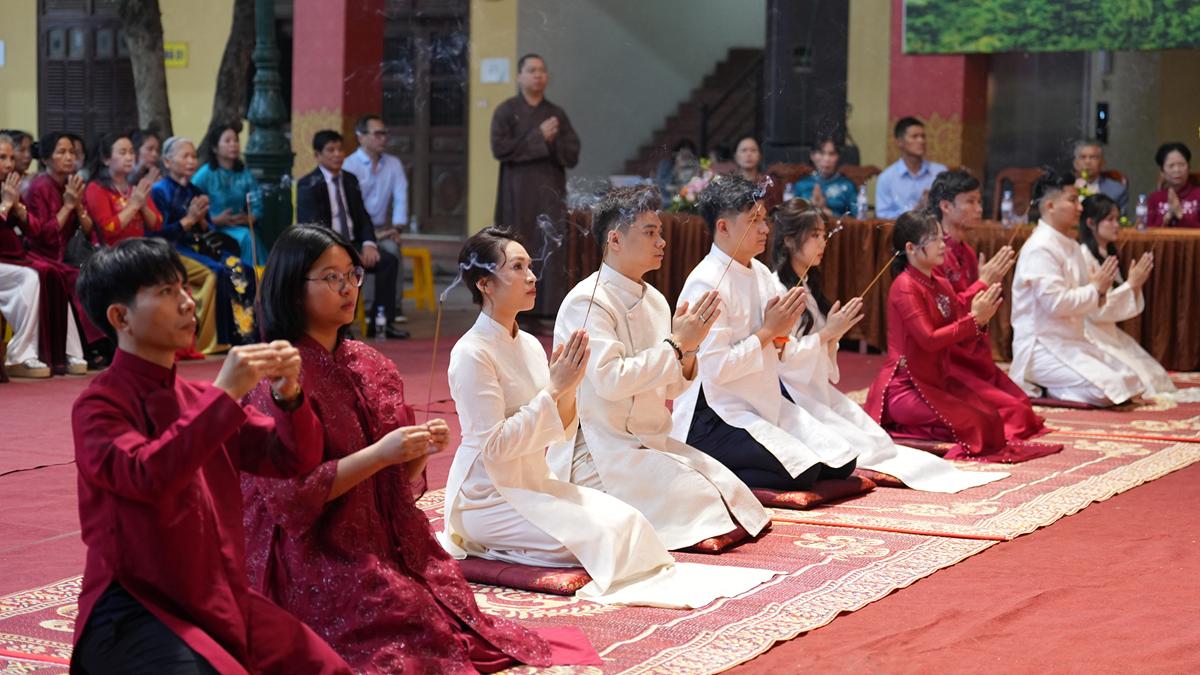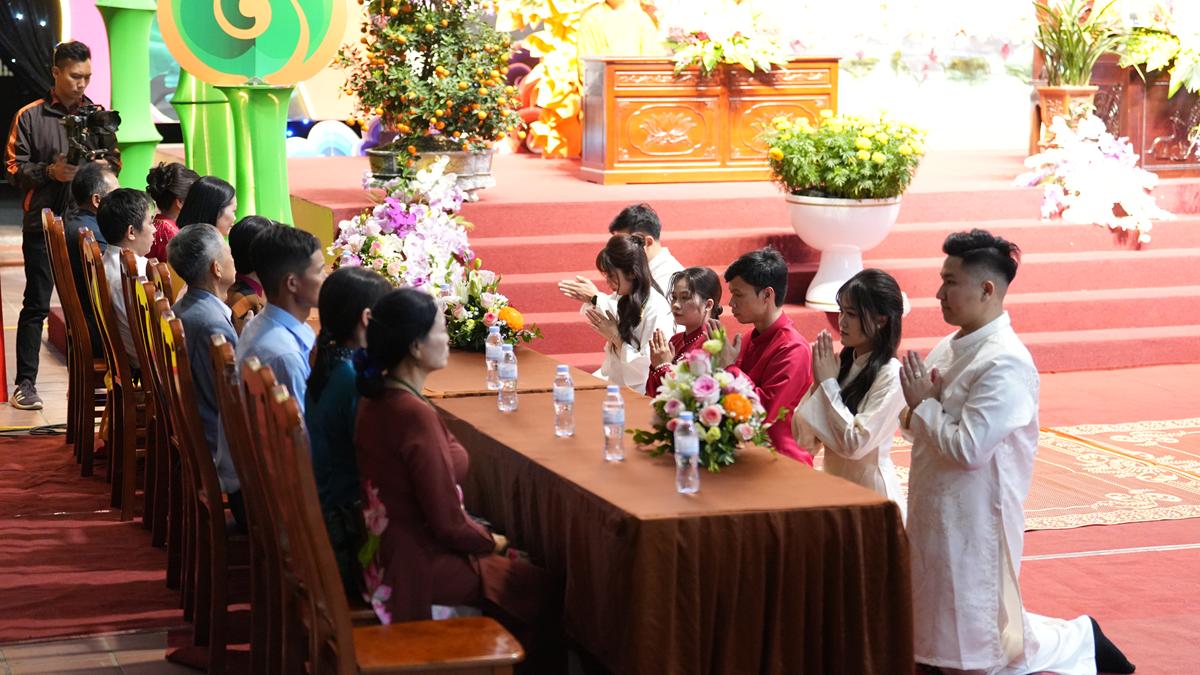 Trước Phật đài trang nghiêm, sáu đôi bạn trẻ: Bùi Huy Công – pháp danh Minh Thành và Phan Minh Hằng – pháp danh Vạn Nhiên; Nguyễn Duy Hùng – Pháp danh Minh Đại và Phan Ánh Ngọc – pháp danh Diệu Bảo; Vũ Đặng Minh Anh – Pháp danh Minh Trí và Ngô Thuỳ Dương – Pháp danh Diệu Tuệ; Lê Anh Tuyên – Pháp danh Minh Khánh và Lưu Hồng Hoa – Pháp danh Diệu Đức; Lê Quốc Phong – Pháp danh Minh Thanh và Trần Thị Huệ Phương – Pháp danh Diệu Hương; Nguyễn Quý Vinh – Pháp danh Trí Vinh và Nguyễn Thị Nhi – Pháp danh Tịnh Nhi đã nên duyên vợ chồng.