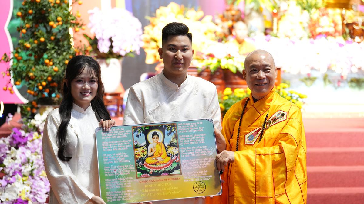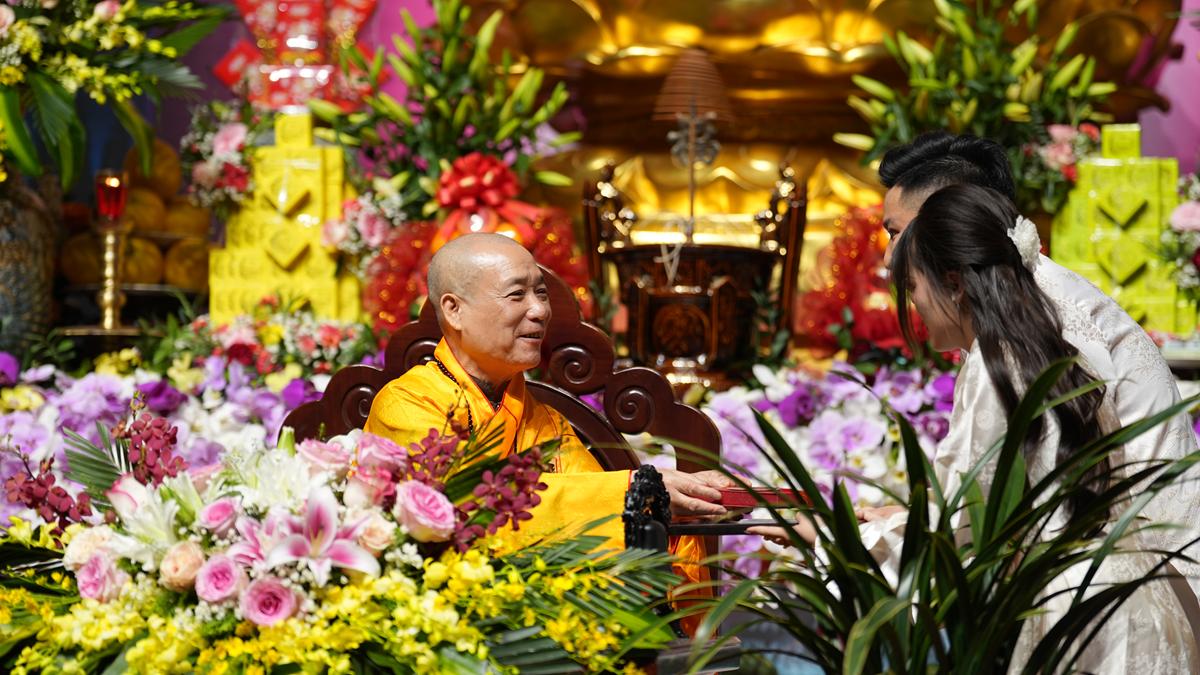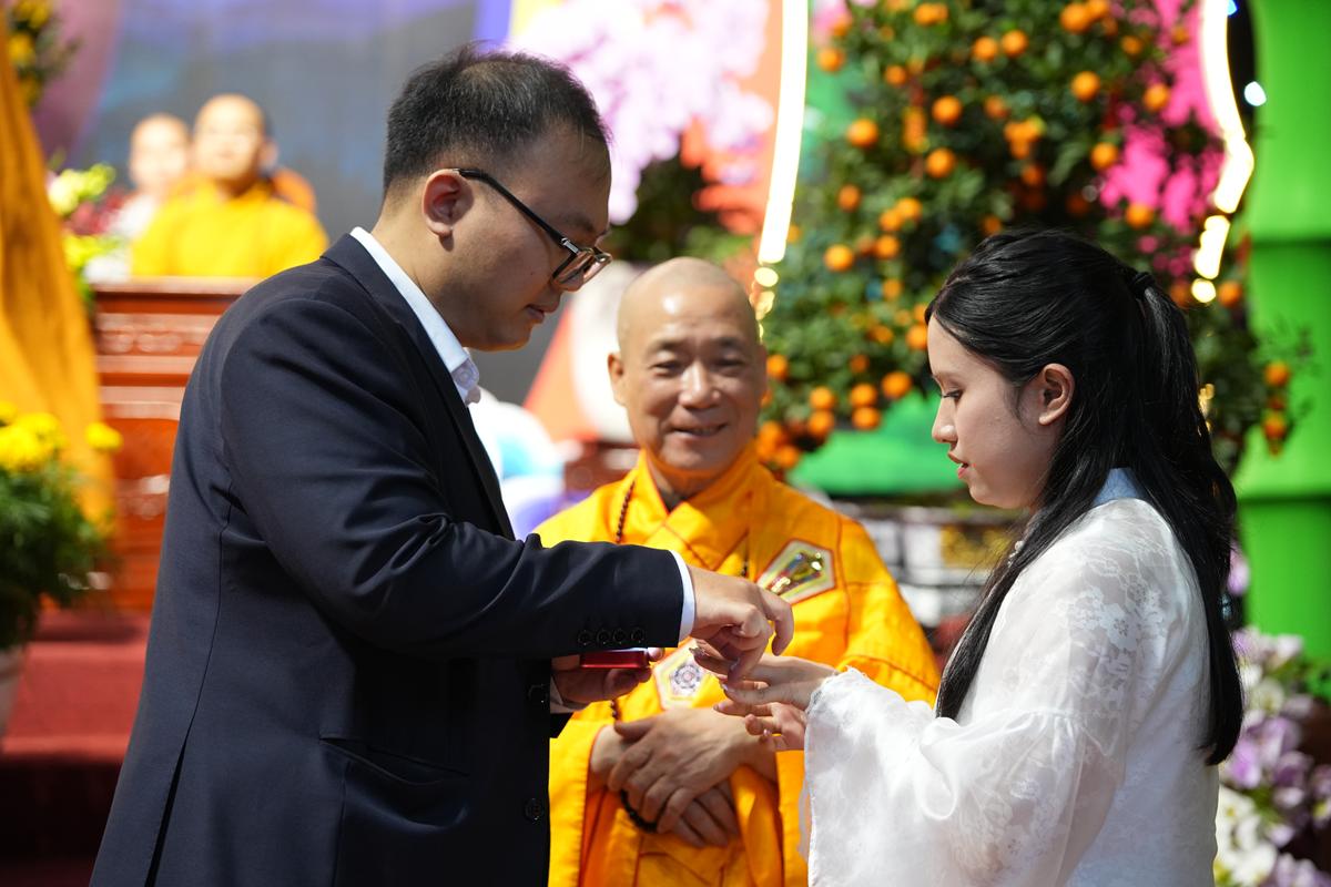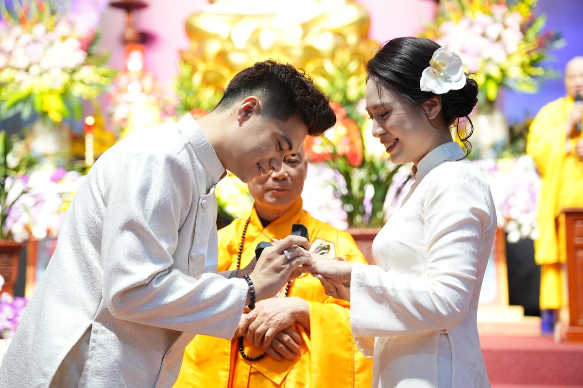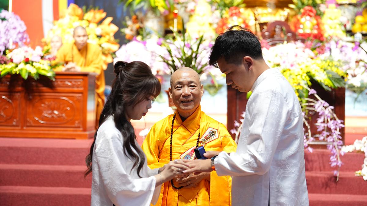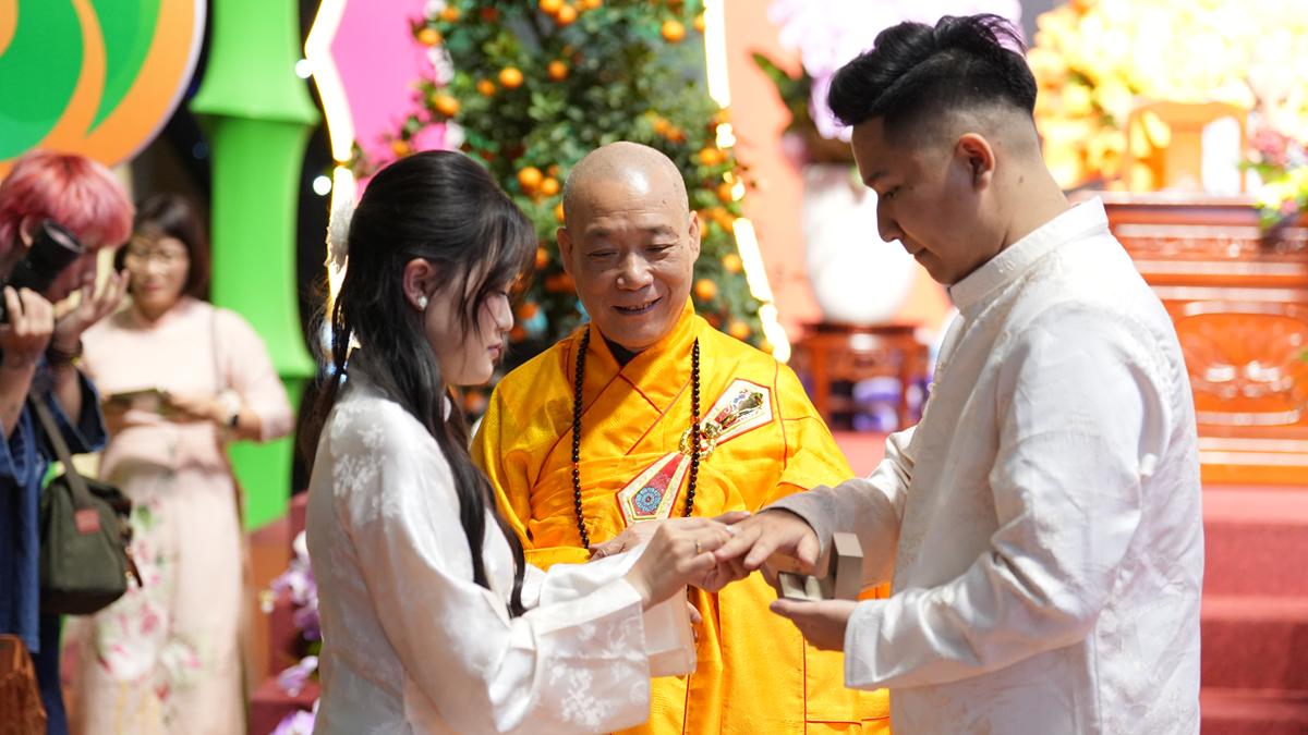 Trong không gian thiêng liêng của chốn già lam, các đôi tân lang – tân nương đã trao nhẫn cưới cho nhau trước sự chứng minh của chư tôn đức, thành kính lễ tạ Tam Bảo, tri ân song thân và phát nguyện đồng hành trong đời sống hôn nhân với tinh thần yêu thương, tôn trọng, bình đẳng và sẻ chia.