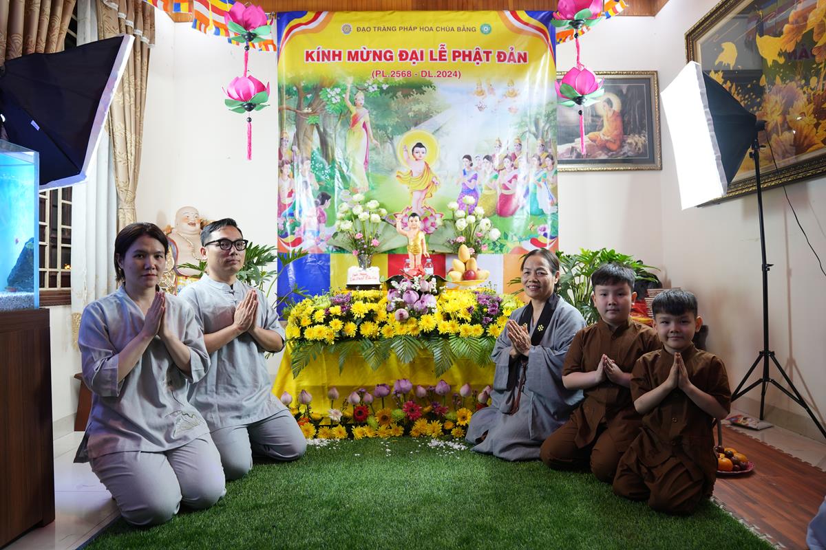 Cũng trong tuần lễ Phật đản từ ngày 7/4 đến ngày Rằm/4 âm lịch, các gia đình Phật tử thuộc Đạo tràng Pháp Hoa chùa Bằng cũng đồng loạt thiết trí lễ đài tại tư gia trang nghiêm và thành kính, cùng hàng xóm và họ hàng tụng kinh Chuyển Pháp Luân và tắm Phật trong niềm hân hoan kính mừng ngày Đức Đại Đạo Sư đản sinh.