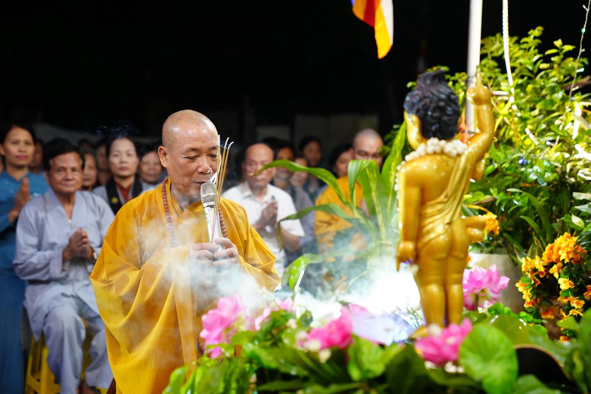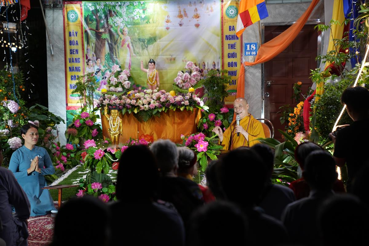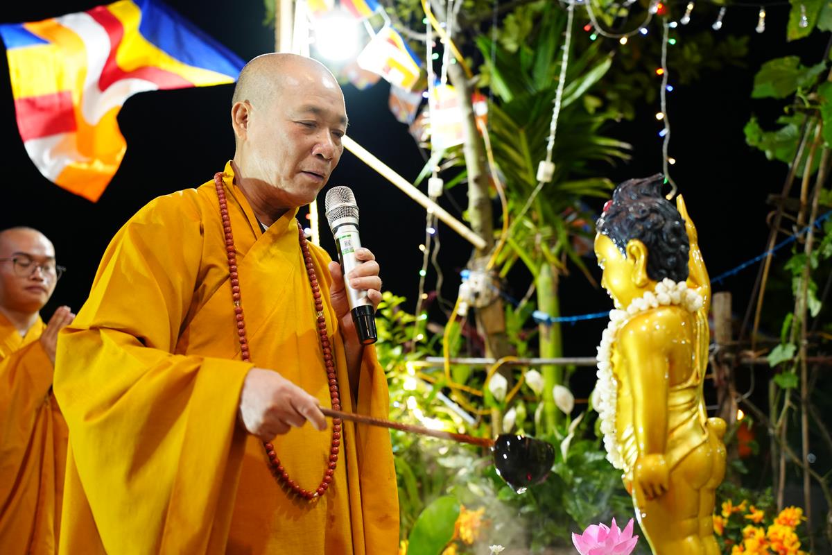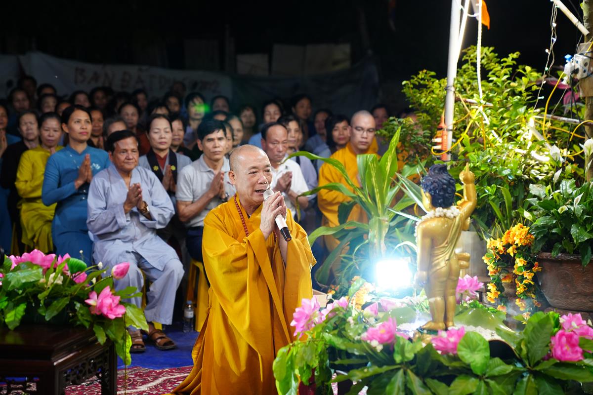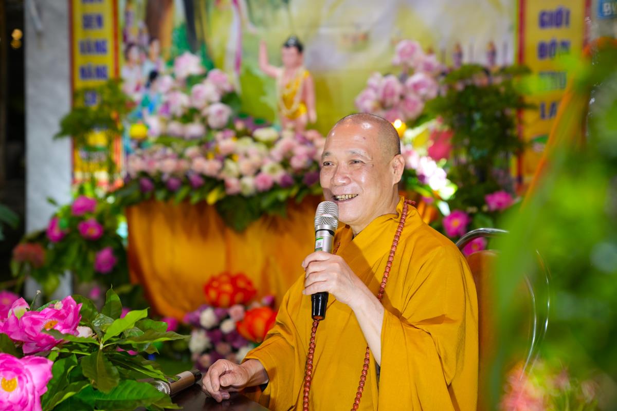 Tiếp đó, Hòa thượng cũng diễn giải về ý nghĩa của ngày Phật Đản. Ngày này được coi là một ngày vô cùng đặc biệt đối với những người con Phật, ngày mà một bậc vĩ nhân ra đời. Ngài là một con người có thật, sinh ra mang thân phận Hoàng Thái Tử cao quý, trong cung vàng, bệ ngọc, lớn lên lấy vợ, sinh con và tương lai sẽ là người đứng đầu cai quản cả một đất nước. Ấy vậy mà, Ngài đã từ bỏ tất cả lại phía sau, đi tìm con đường giải thoát cho bản thân và rồi Ngài đã đắc đạo thành Phật. Đến ngày hôm nay, giáo Pháp của Đức Phật đã lan tỏa trên khắp thế gian, người người, nhà nhà đều tôn kính Ngài. Nếu không có đức Phật thì sẽ không có chư Tăng, không có người hoằng truyền chính pháp.