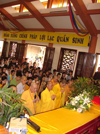 7 giờ 30, chư Tăng quang lâm hội trường trong sự cung nghênh đầy thành kính của các em. Thượng tọa Bảo Nghiêm dẫn đầu chư Tăng, niêm hương, dâng lời bạch Phật, hành lễ cầu nguyện. Ngài thay mặt các em cầu mong chư Phật tuệ quang thường chiếu, khai thị cho các em sáng tâm, sáng trí, mạnh khoẻ, tinh tấn và thành tựu trong các kì thi sắp đến. Các em quỳ trước tôn tượng đức Bản sư Thích Ca niêm hoa, chắp tay thành kính cầu nguyện. Không khí thiêng liêng ngập tràn, đầy xúc động. Niềm tin về sự gia hộ của chư Phật từ buổi lễ hôm nay chắc chắn sẽ giúp các em tự tin hơn, mạnh mẽ hơn, và an lạc hơn để vượt qua áp lực thi cử.
