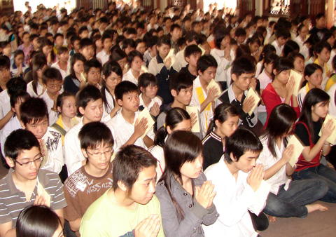 Các em học sinh thành tâm cầu nguyện chư Phật, chư Bồ Tát phù hộ