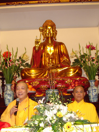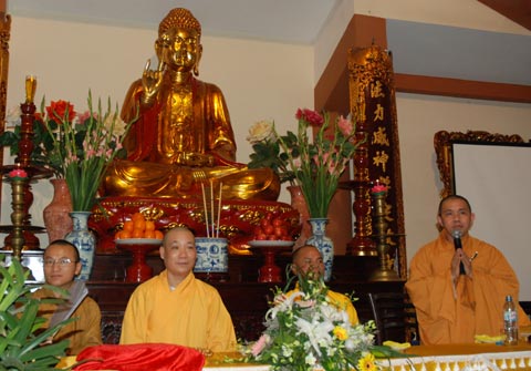 Thượng tọa Thích Tấn Đạt – Phó ban Hoằng pháp Trung ương chia sẻ với các em về một số tấm gương hiếu học cổ kim, như “tấm gương sống” hiện đang hành hoá là GS.TS. Lê Mạnh Thát, nhất là nhị vị tiến sĩ Thích Đức Thiện và Thích Nhật Từ đang an vị trên ghế chủ tọa ngay trong hội trường. Người thật việc thật, “dĩ thân vi giáo” – “lấy thân mình làm tấm gương mà dạy” vẫn là điều tối ưu trong sư phạm xưa nay.
