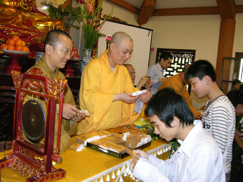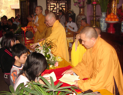 Kết thúc buổi lễ, các em hào hứng, phấn khởi dâng lên chư Tăng bản đăng kí ước nguyện phấn đấu học hành và thi cử đỗ đạt; nhận từ chư Tăng chiếc lá bồ đề trí tuệ và tinh tiến, như là “báu vật” bảo mệnh, hộ trì trên con đường học và thi của các em.