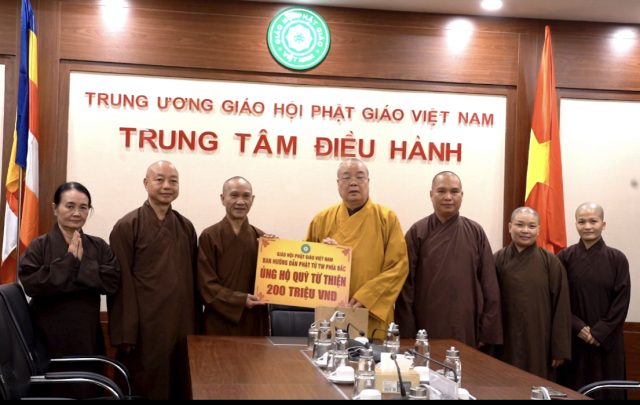 Thực hiện Thông bạch vận động cứu trợ đồng bào bị thiệt hại do bão số 3 của Trung ương GHPGVN. Chiều ngày 3/10/2024 (01/9/Giáp Thìn), phái đoàn Ban Hướng dẫn Phật tử Trung ương khu vực phía Bắc do Hoà Thượng Thích Thanh Điện – Phó chủ tịch HĐTS TƯ GHPGVN – Phó Thường trực  Ban hướng dẫn Phật tử Trung ương đặc trách phía Bắc làm trưởng đoàn đã tới trao ủng hộ đồng bào nhân dân vùng lũ tại Trụ sở TƯ GHPGVN – chùa Quán Sứ – Hoàn Kiếm – Hà Nội .