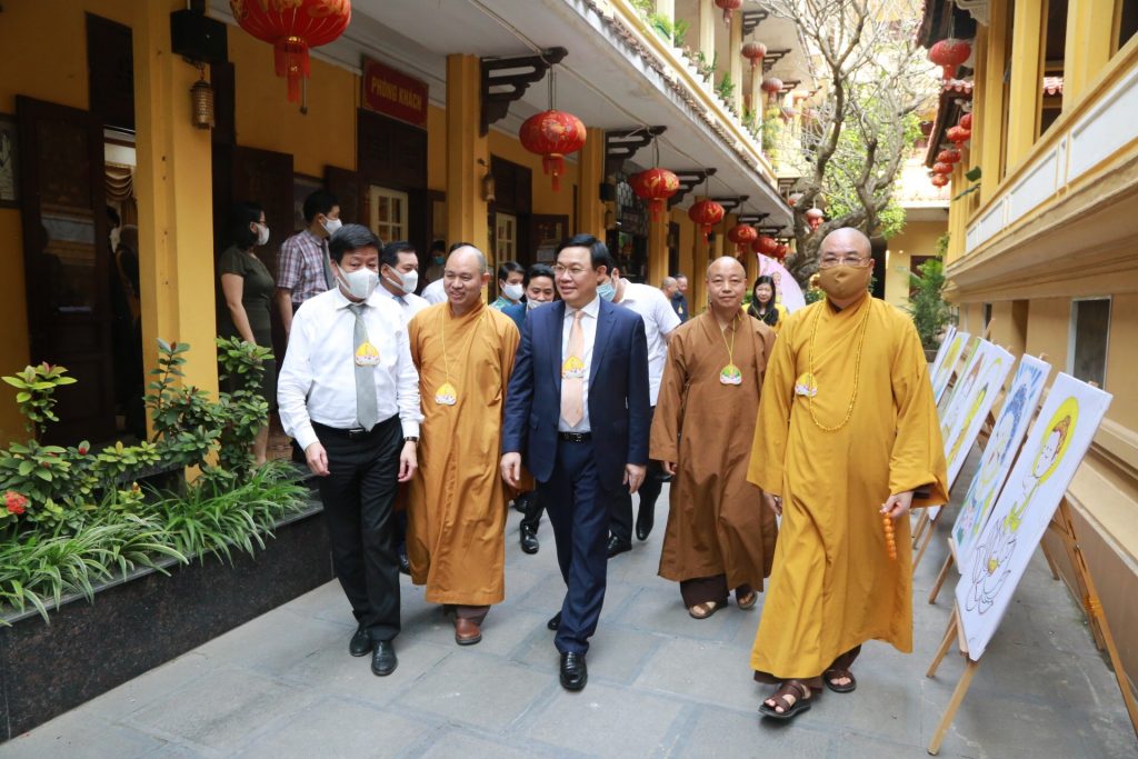 Thân mật đón tiếp đoàn lãnh đạo có HT. Thích Thanh Nhiễu – Phó Chủ tịch Thường trực HĐTS GHPGVN, Phó Trưởng ban Tăng sự Trung ương; HT. Thích Gia Quang – Phó Chủ tịch HĐTS GHPGVN, Trưởng ban Thông tin Truyền thông T.Ư; TT. Thích Đức Thiện – Phó Chủ tịch kiêm Tổng Thư ký HĐTS GHPGVN, Trưởng Ban Phật Giáo Quốc tế TƯ; HT. Thích Thanh Điện – Phó Tổng Thư ký HĐTS, Chánh văn phòng I T.Ư GHPGVN; HT. Thích Thanh Đạt – Ủy viên Thư ký HĐTS T.Ư GHPGVN; TT. Thích Thanh Tuấn, TT. Thích Thanh Huân đồng Phó chánh Văn phòng I T.Ư GHPGVN. Phái đoàn lãnh đạo thành phố Hà Nội tới thăm chùa Quán Sứ do ông Vương Đình Huệ – Ủy viên Bộ Chính trị, Bí thư Thành ủy, Trưởng đoàn Đại biểu Quốc hội thành phố Hà Nội làm trưởng đoàn.