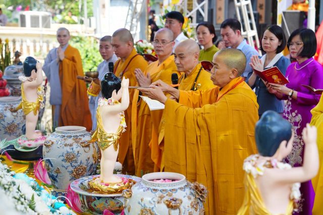 Khép lại buổi lễ, chư Tôn đức cùng toàn thể đại chúng trang nghiêm cử hành nghi thức niêm hương bạch Phật, tụng kinh Phật đản và thực hiện lễ tắm Phật trong khói hương quyện tỏa, tạo nên sự thiêng liêng như kết nối tâm linh giữa người và Đức Phật.
