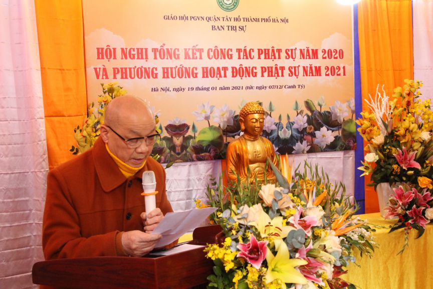 ĐĐ Thích Nguyên Chính – Chánh thư ký BTS GHPGVN quận Tây Hồ thay mặt BTS đọc Báo cáo tổng kết công tác Phật sự năm 2020 và phương hướng hoạt động Phật sự năm 2021.