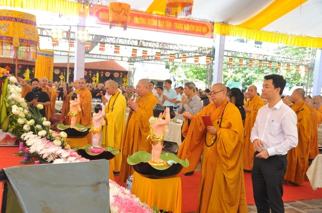 Sau cùng, trong giây phút thiêng liêng, hương trầm quyện tỏa, chư Tôn đức Tăng, Ni và toàn thể hội chúng đã trang nghiêm cử hành nghi thức niêm hương bạch Phật, tụng kinh khánh đản, cử hành nghi thức tắm kim thân Đức Phật sơ sinh và thả chim bồ câu cầu nguyện thế giới hòa bình, Phật pháp xương minh, nhân dân an lạc hạnh phúc.