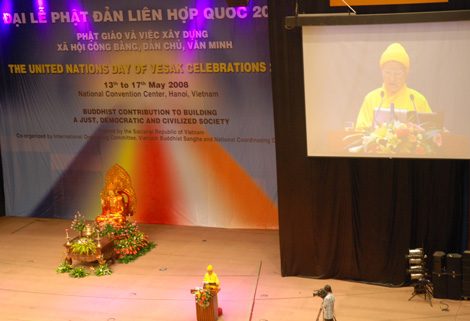 Diễn văn chào mừng viết tiếp “Có được ngày trọng đại hôm nay, trước hết được sự đồng thuận của Ủy ban Tổ chức quốc tế IOC, đứng đầu là HT. Dhamma Kosajarn và được khẳng định trong tuyên bố tại Bangkok – Thái Lan năm 2007, chấp thuận cho Chính phủ Việt Nam, Giáo hội Phật giáo Việt Nam đăng cai tổ chức Đại lễ Phật đản Liên hợp quốc năm 2008 tại Việt Nam.”